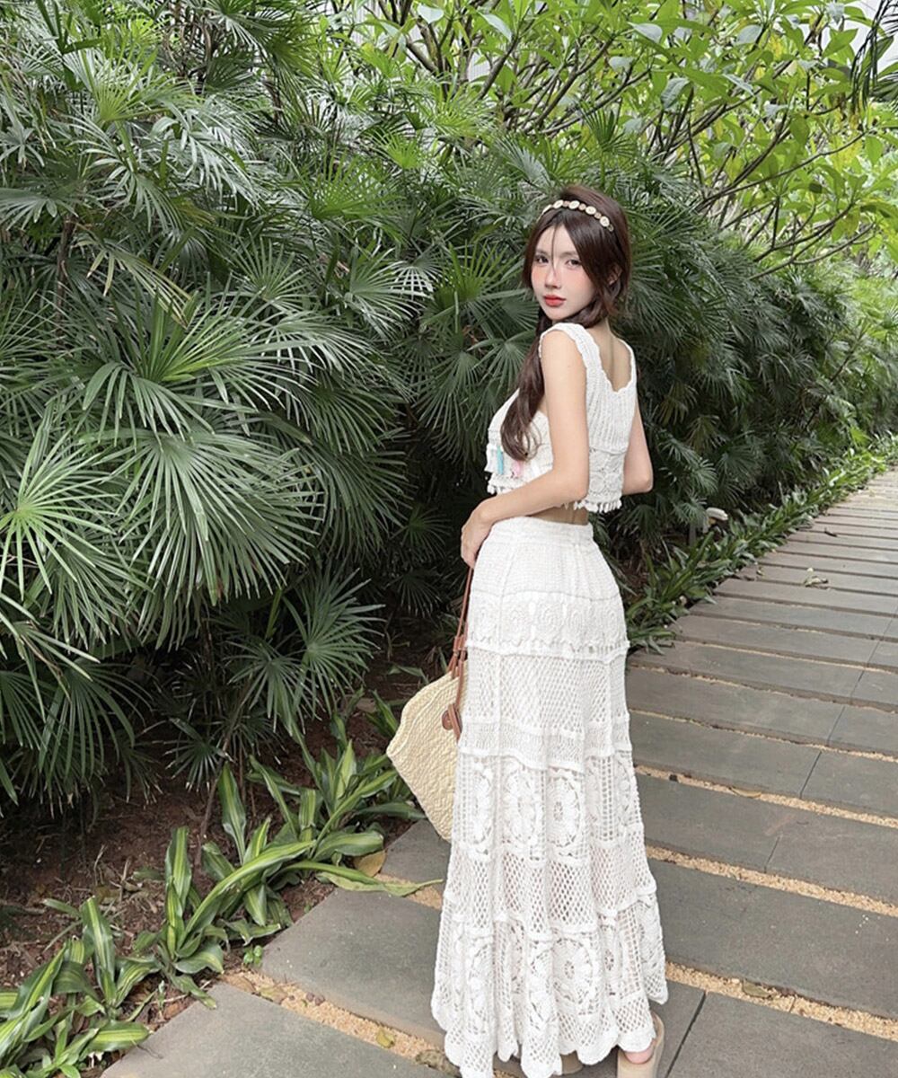 トレンドのクロシェ編みサマーニット2ピースセットアップ