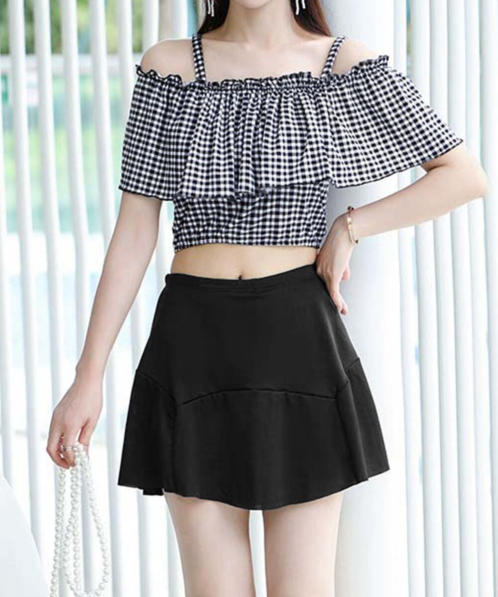水着 オフショルダーチェック柄水着韓国風