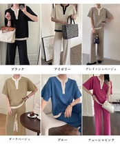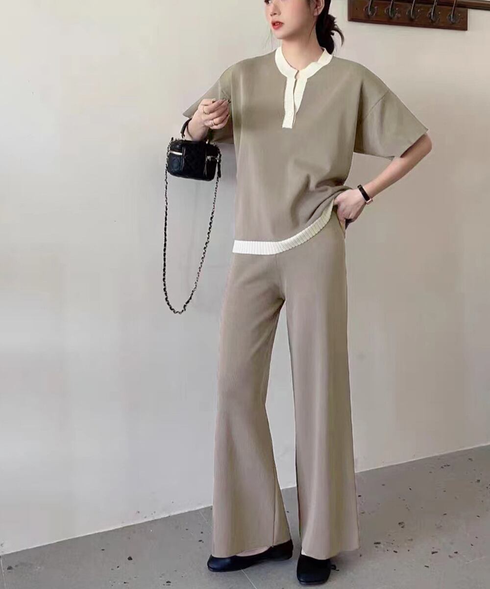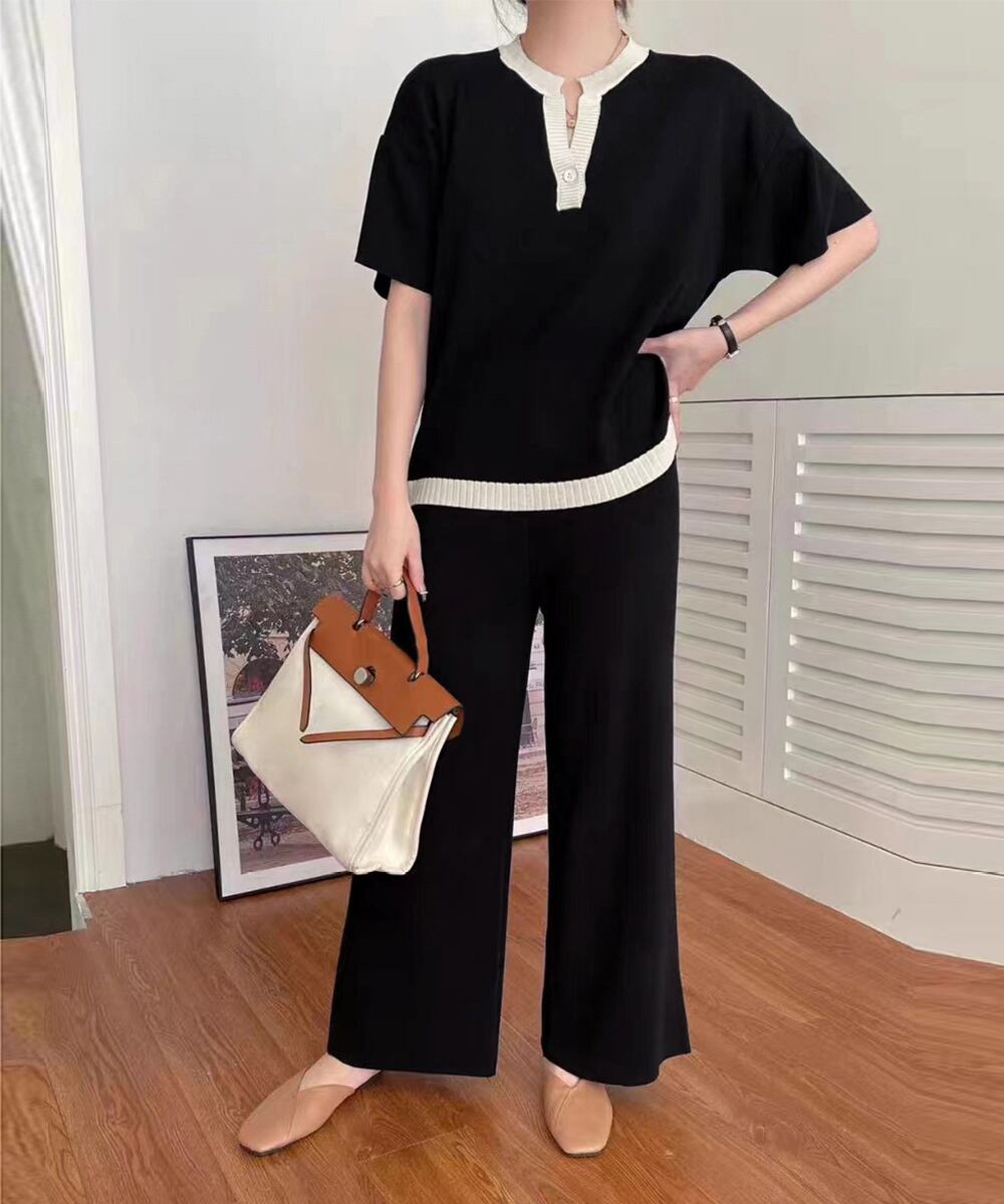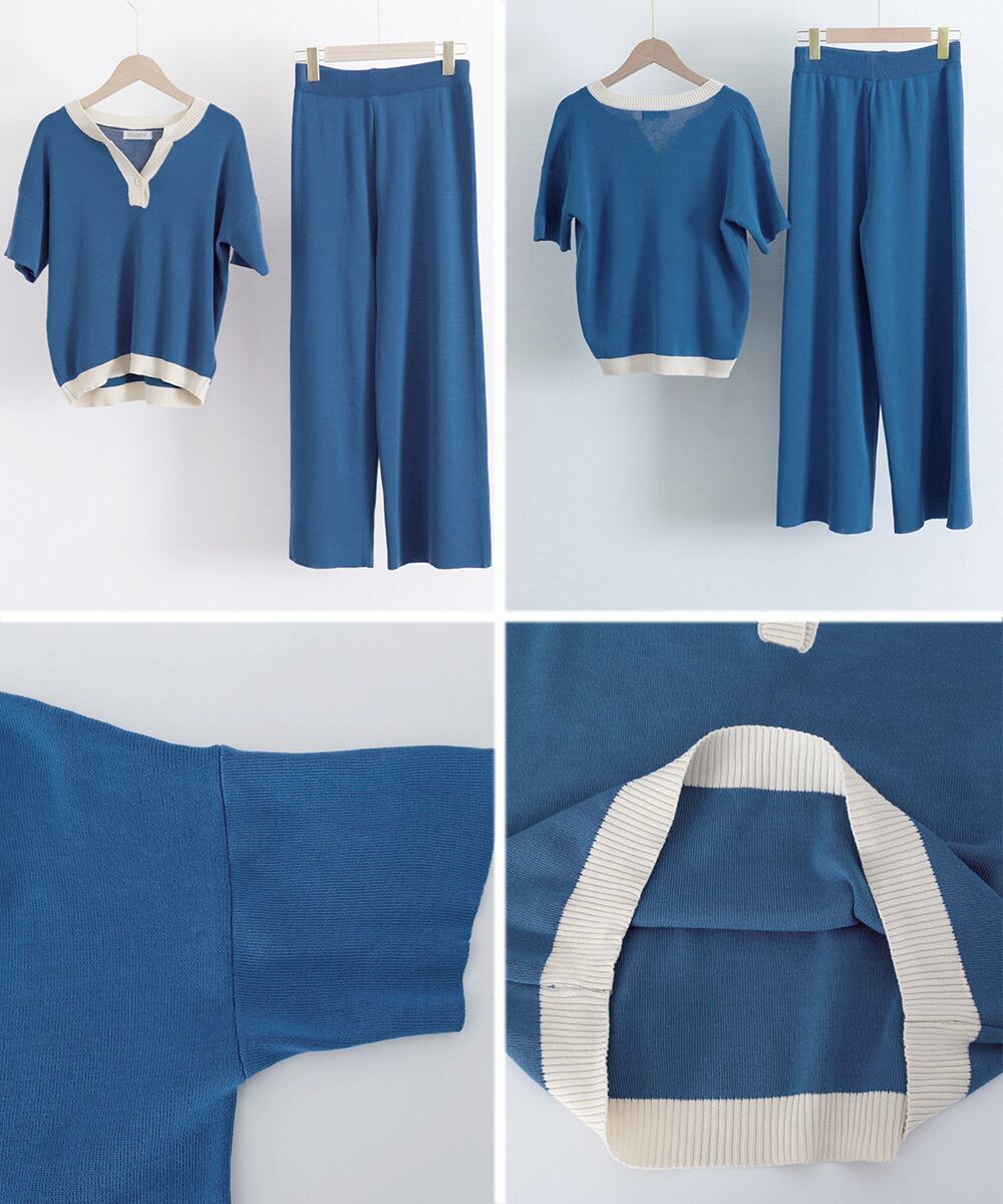 配色サマーニット韓国風 Vネック 半袖ニットトップス ニットワイドパンツ 2点セットオフィスカジュアル ツーピースセット