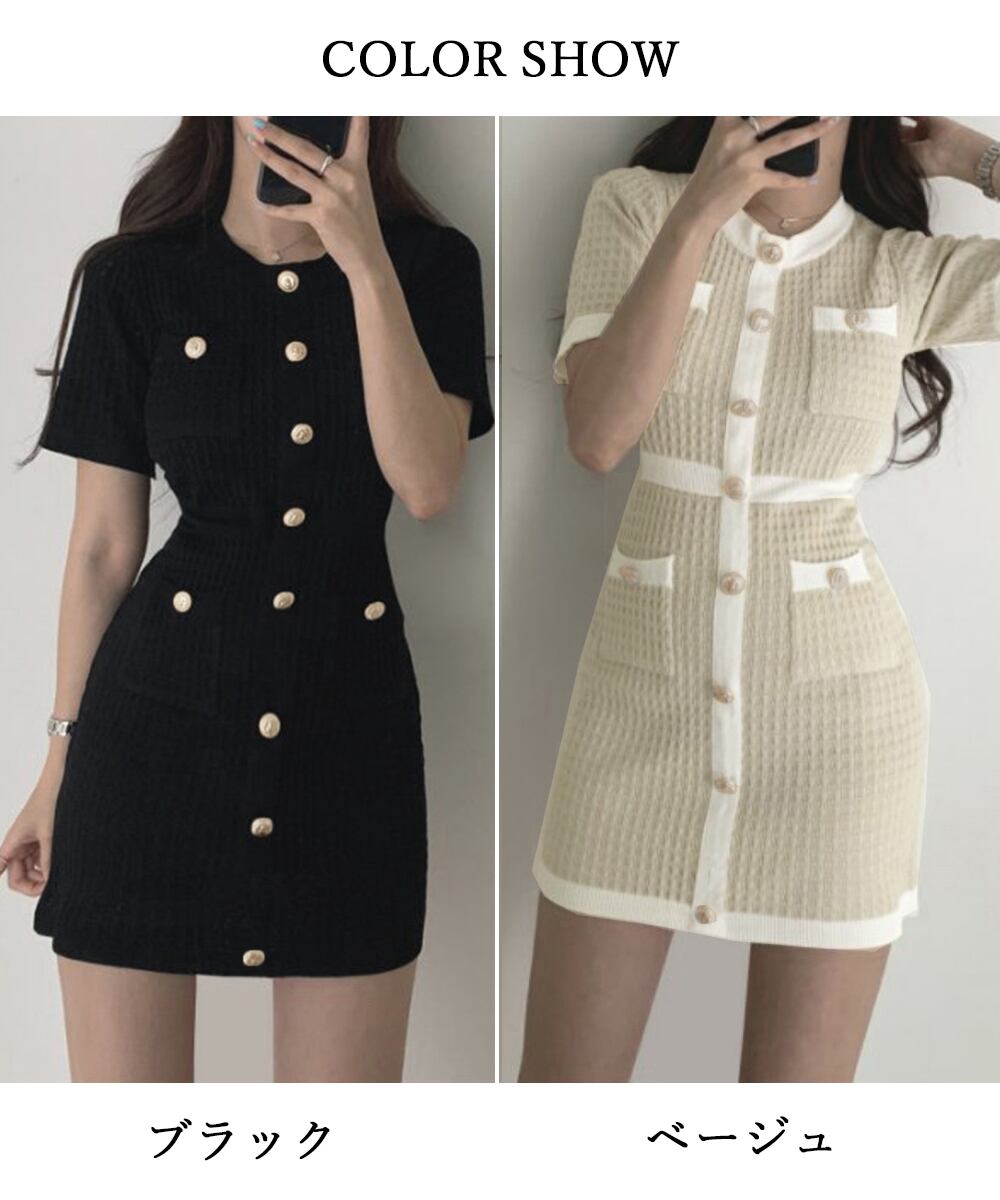 飾りシルバーボタンのデザインが華やかな半袖ニットワンピース