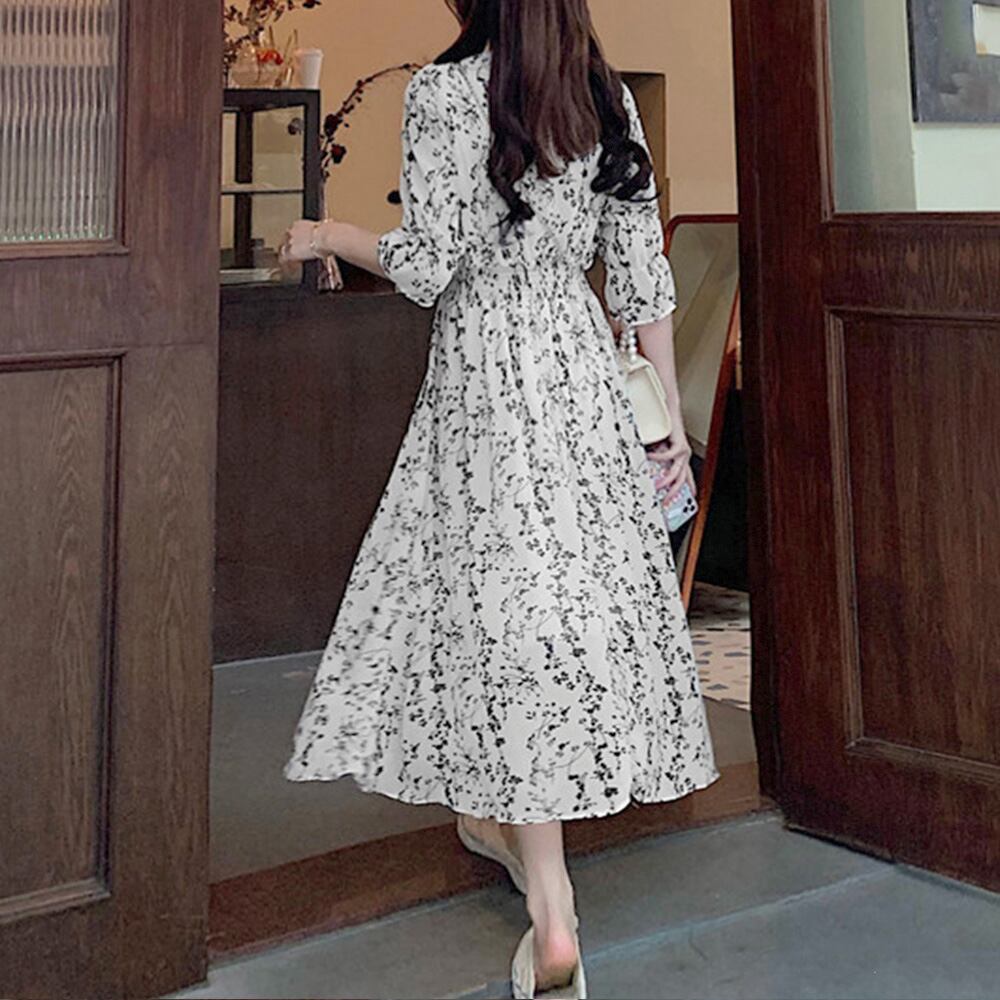 レディース 上品 Vネック ロングワンピース 半袖 リゾートワンピ レジャー旅行 大人サマーワンピ ウエストマーク韓国風
