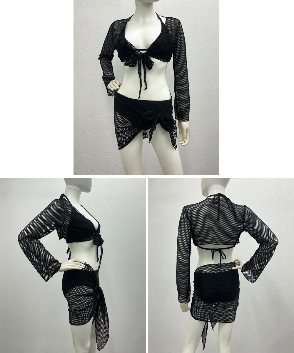 メッシュ素材でお作りしたパレオとボレロがモダンなテイストを添えるスイムウェアセット