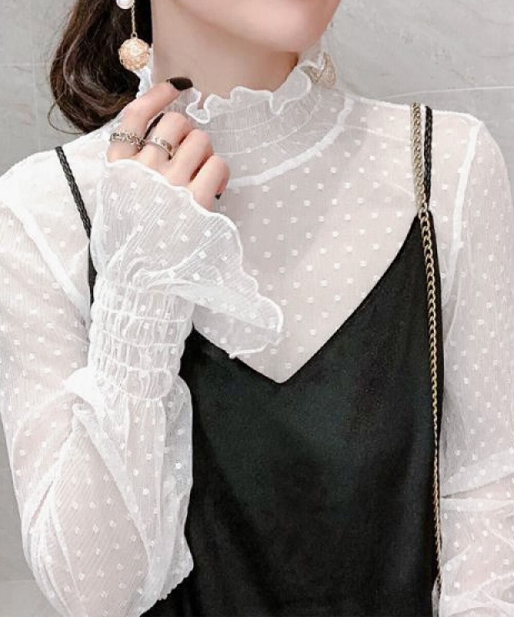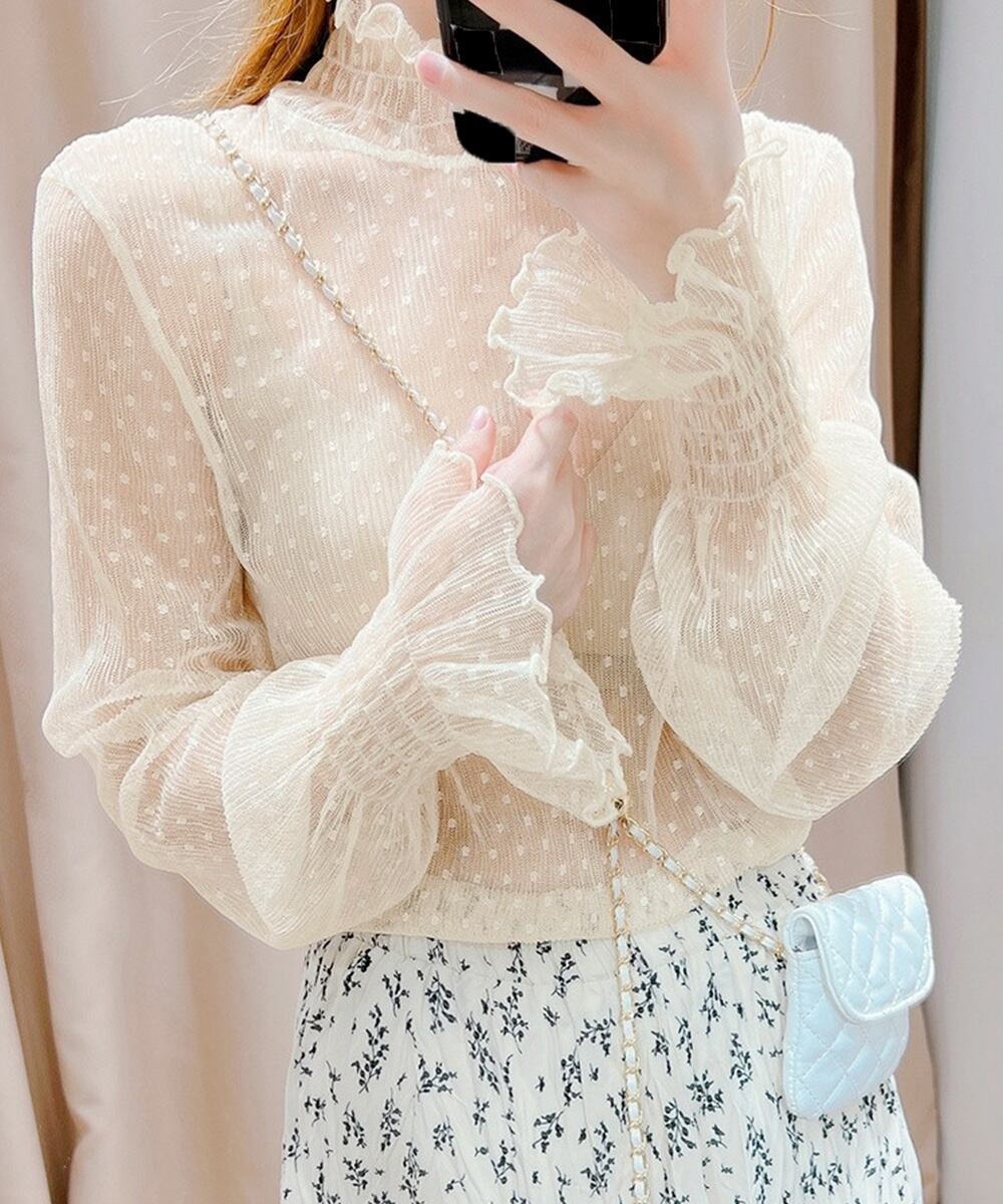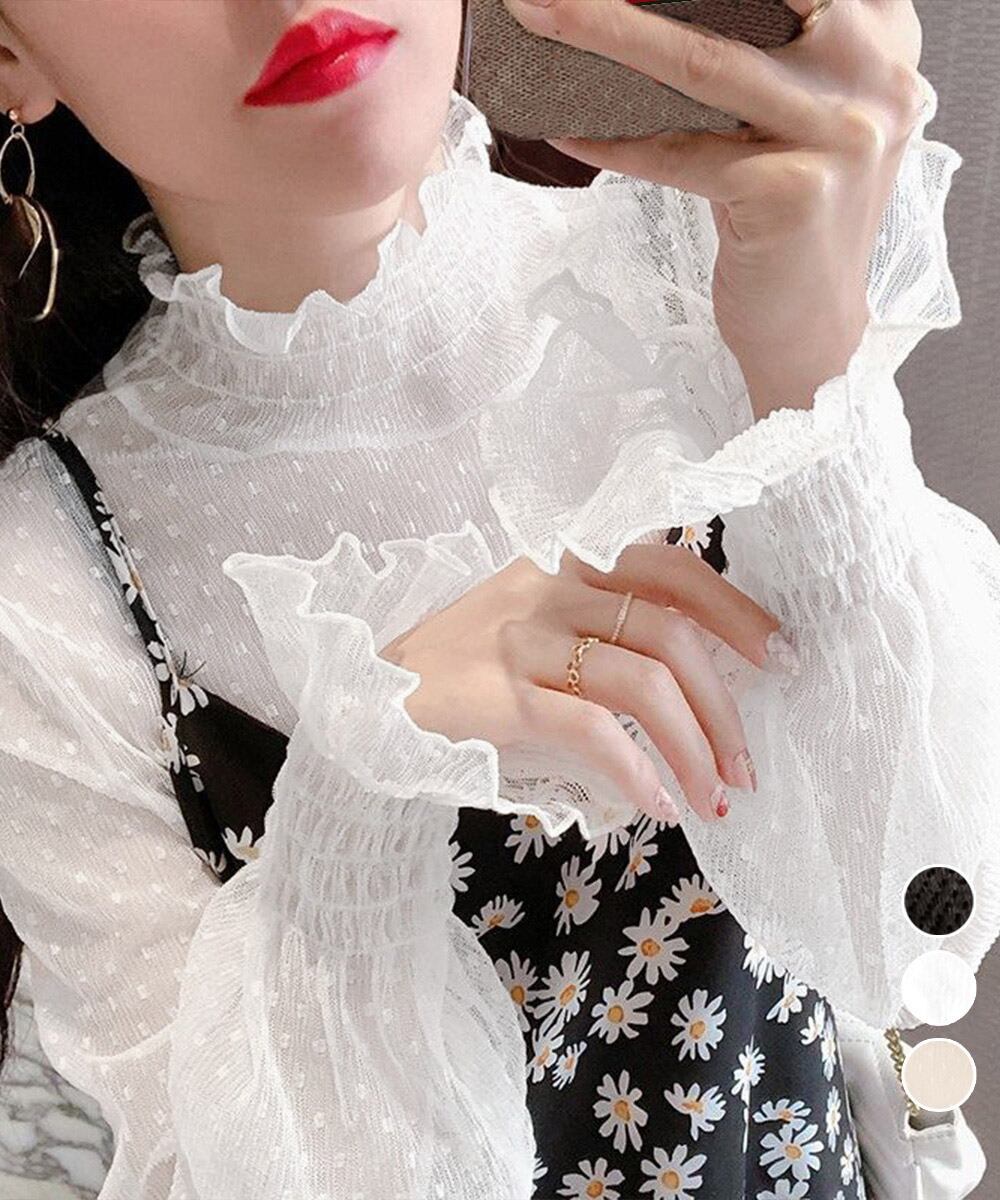 レディースフリルハイネック 重ね着チュールブラウス トランペットスリーブ 透け感着やせトップス フェミニンブラウス韓国風