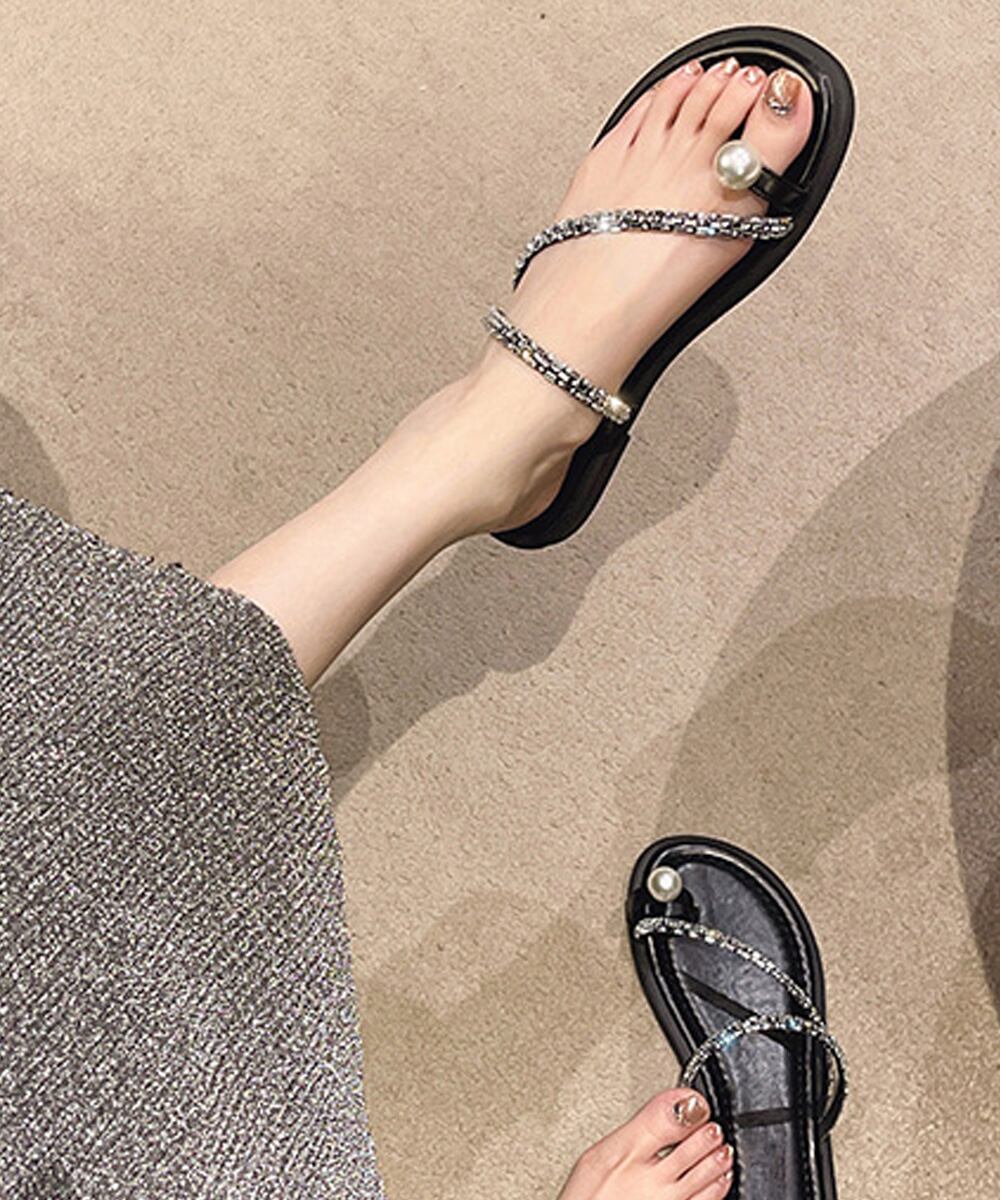 きらきら輝くビジューで飾られた細いストラップが、ヌーディーですっきりとした足元を演出する親指トングサンダル