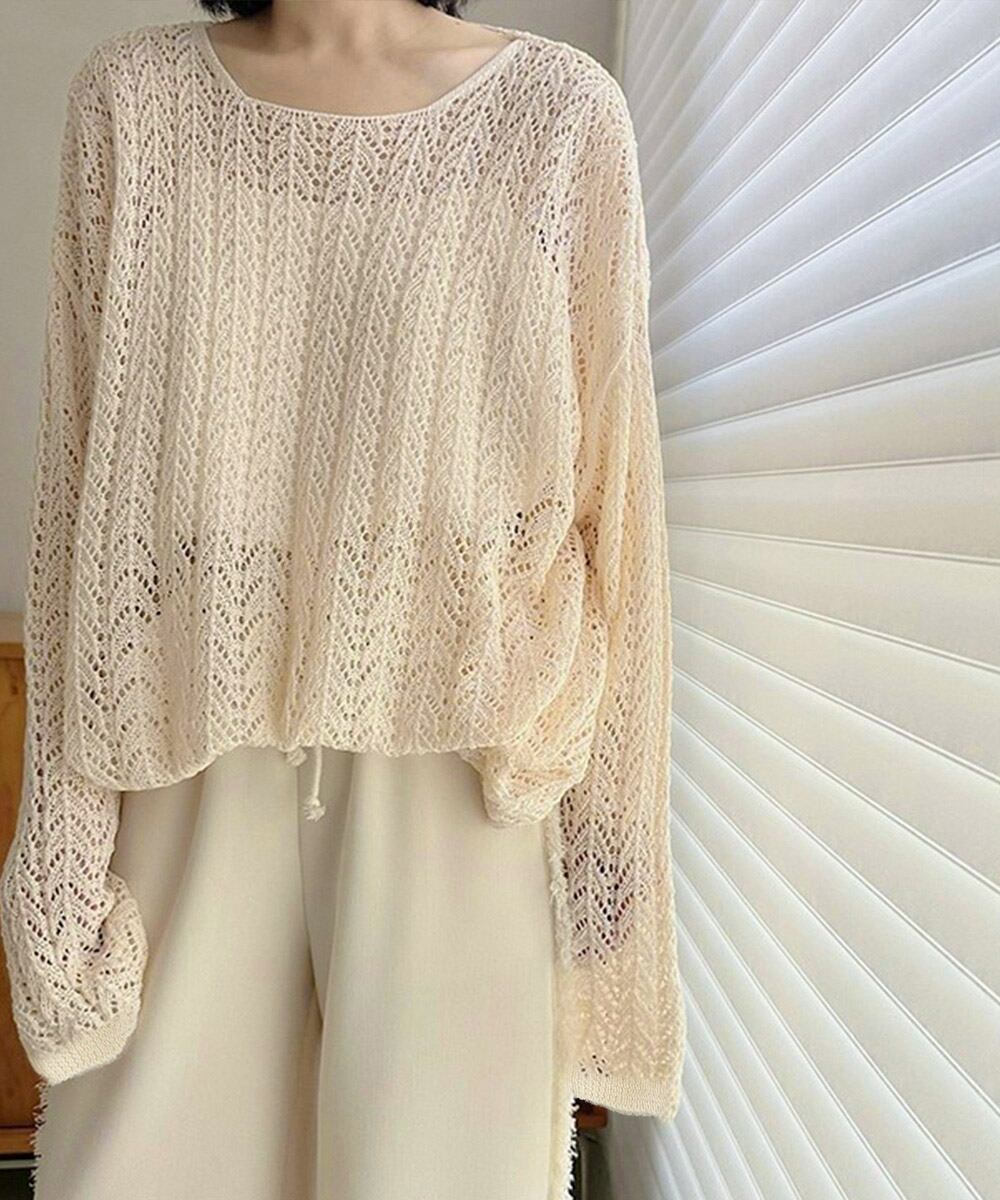 シースルー風の透け感がおしゃれな透かし編みニットトップス