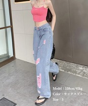 鮮やかなピンクカラーと絶妙なダメージ加工が、カジュアルながらもスタイリッシュな印象を演出