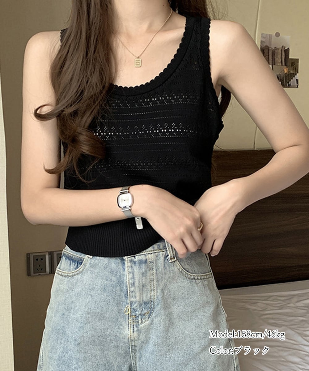 透かし編みが特徴の、甘さ控えめな大人のニットタンクトップ