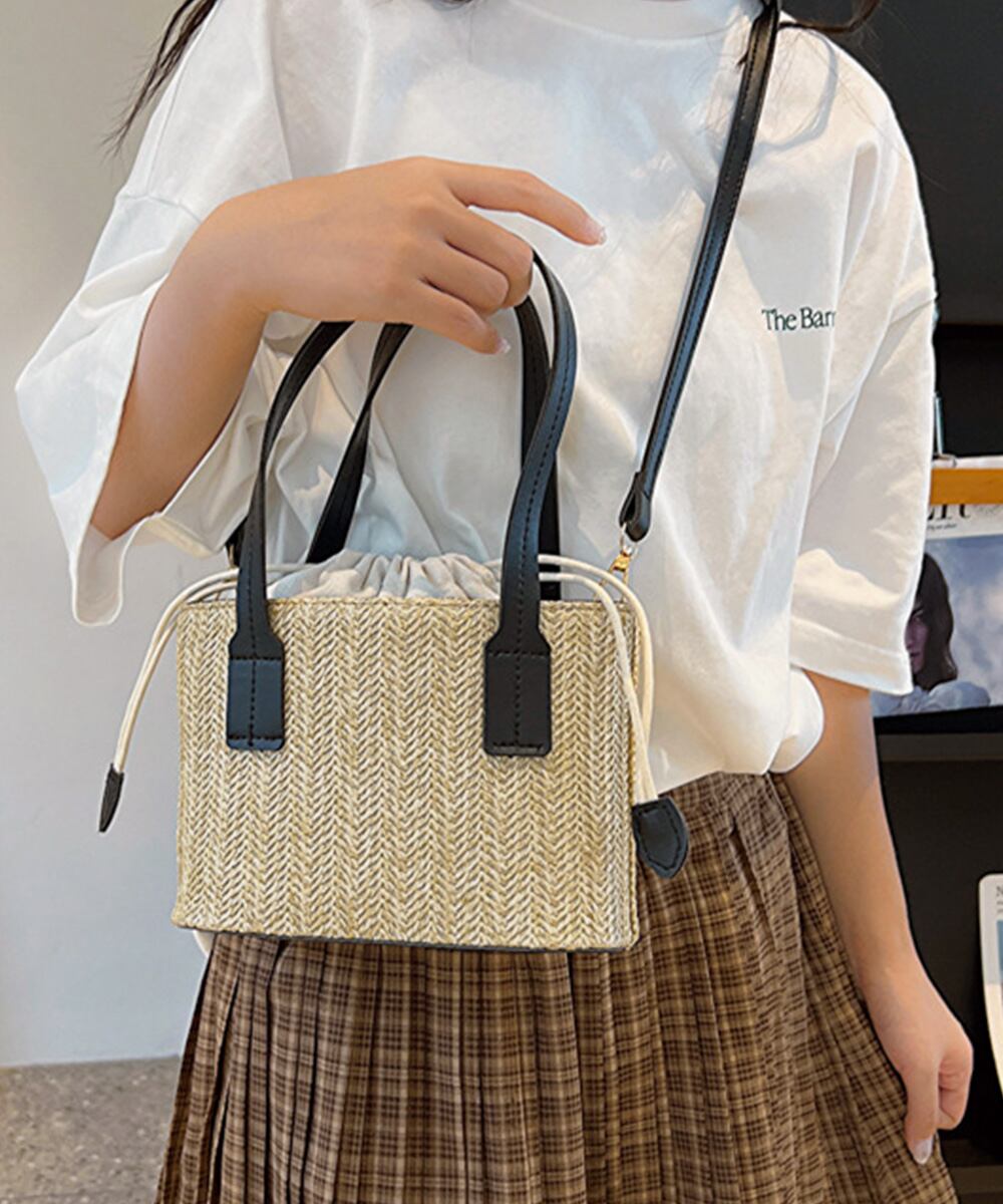 夏っぽい麦わら素材とフェイクレザーがカジュアルになり過ぎず、小さめで持ち運びも楽々