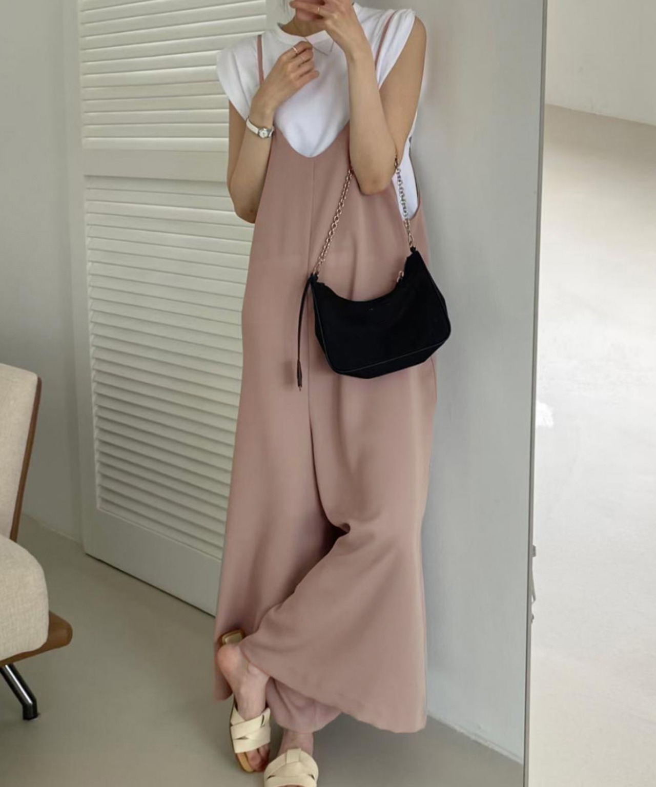 細めのストラップと前後Vラインがフェミニンで大人っぽい、キレイめに着られる大人サロペット