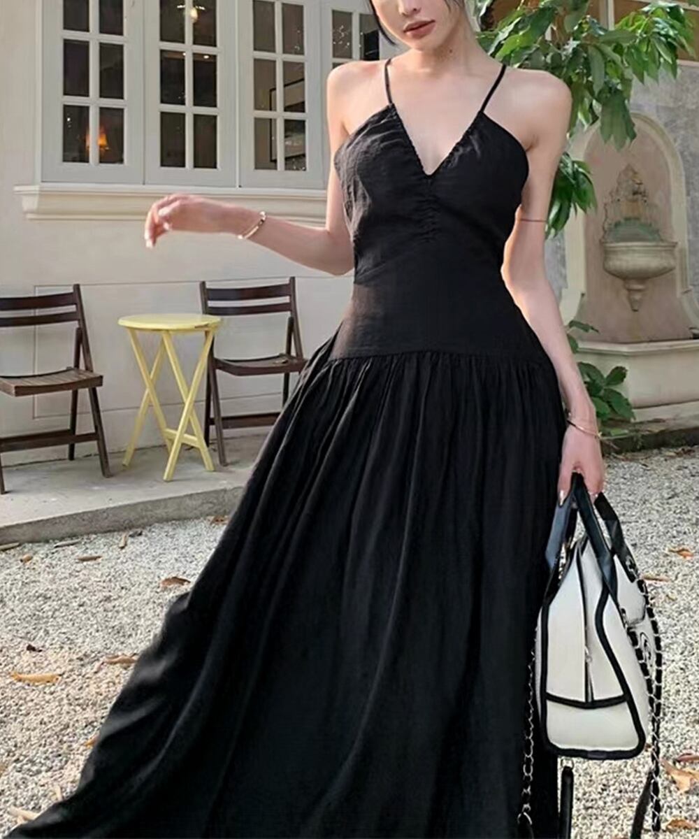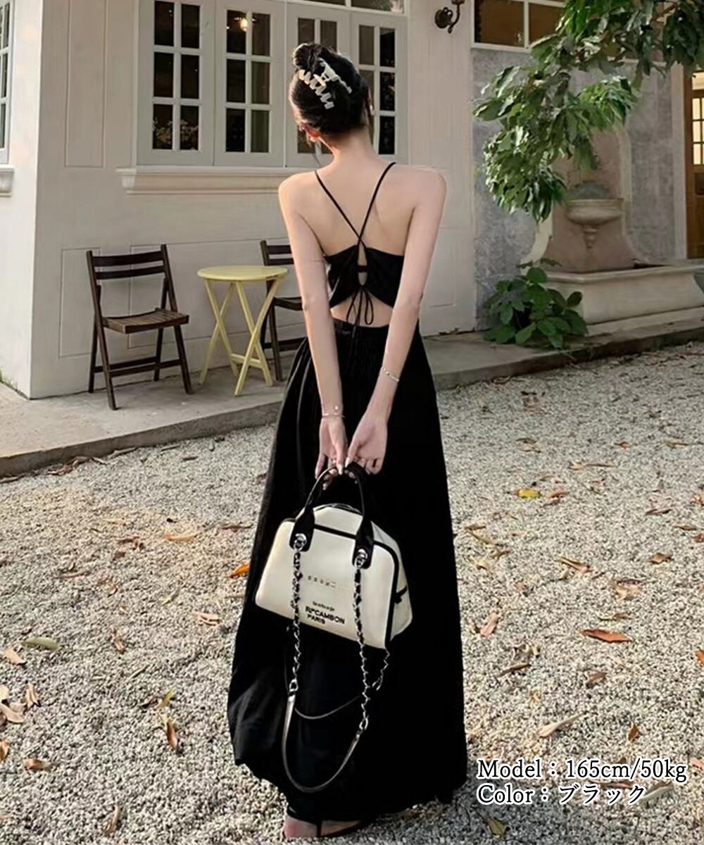 胸元のシャーリングアクセントでさりげないニュアンスチェンジが楽しめ、バックスタイルのリボン結びと肌見せがセンシュアルな印象に