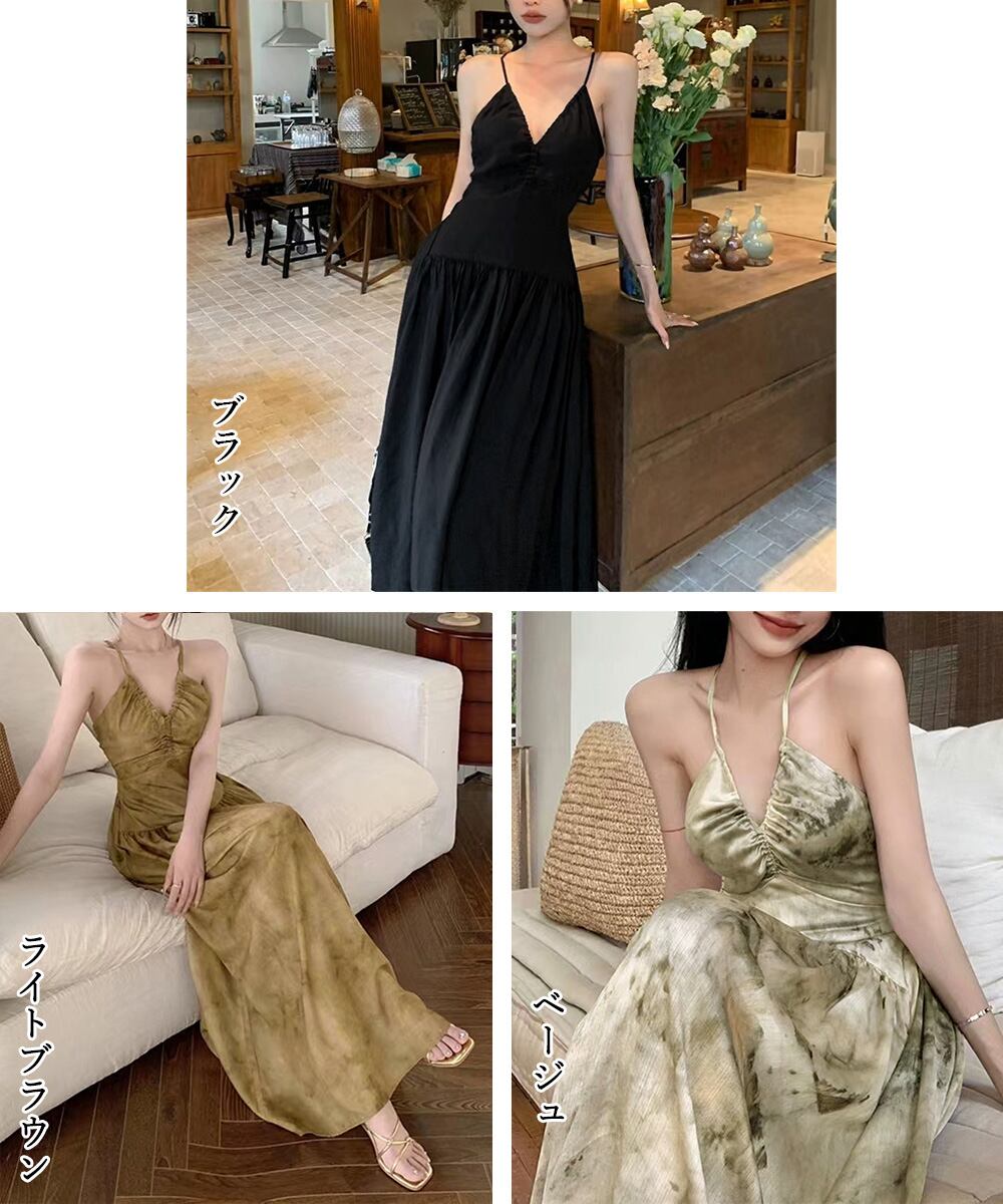 リゾートワンピース レディース バックオープン ロングワンピ体型カバー Vネック タイダイ柄ワンピース ハイウエスト旅行