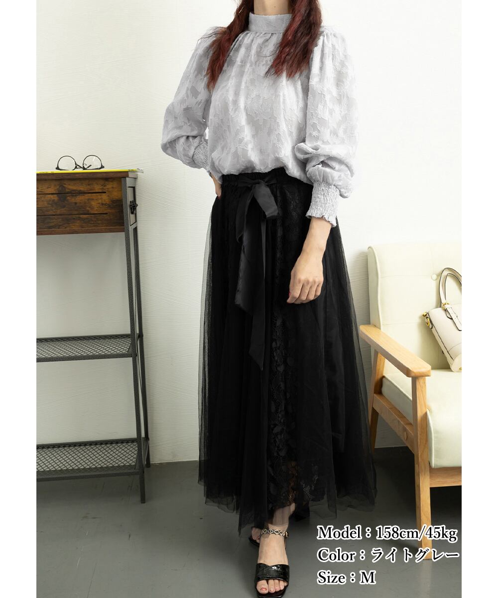 レディース フラワージャガード 春夏長袖ブラウス 花柄 ぽわん袖 フェミニントップス ギャザーブラウス キレイめ 透け感