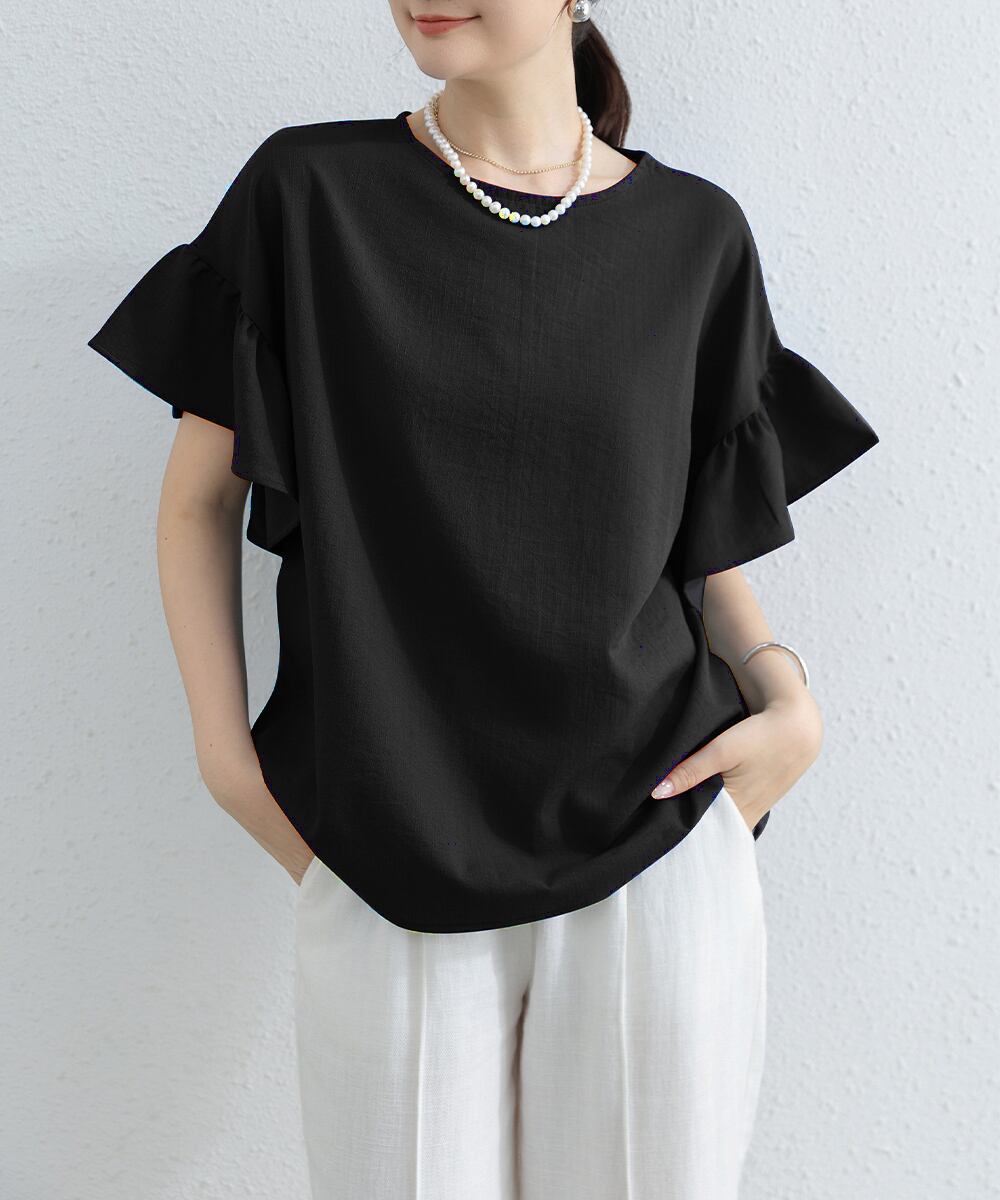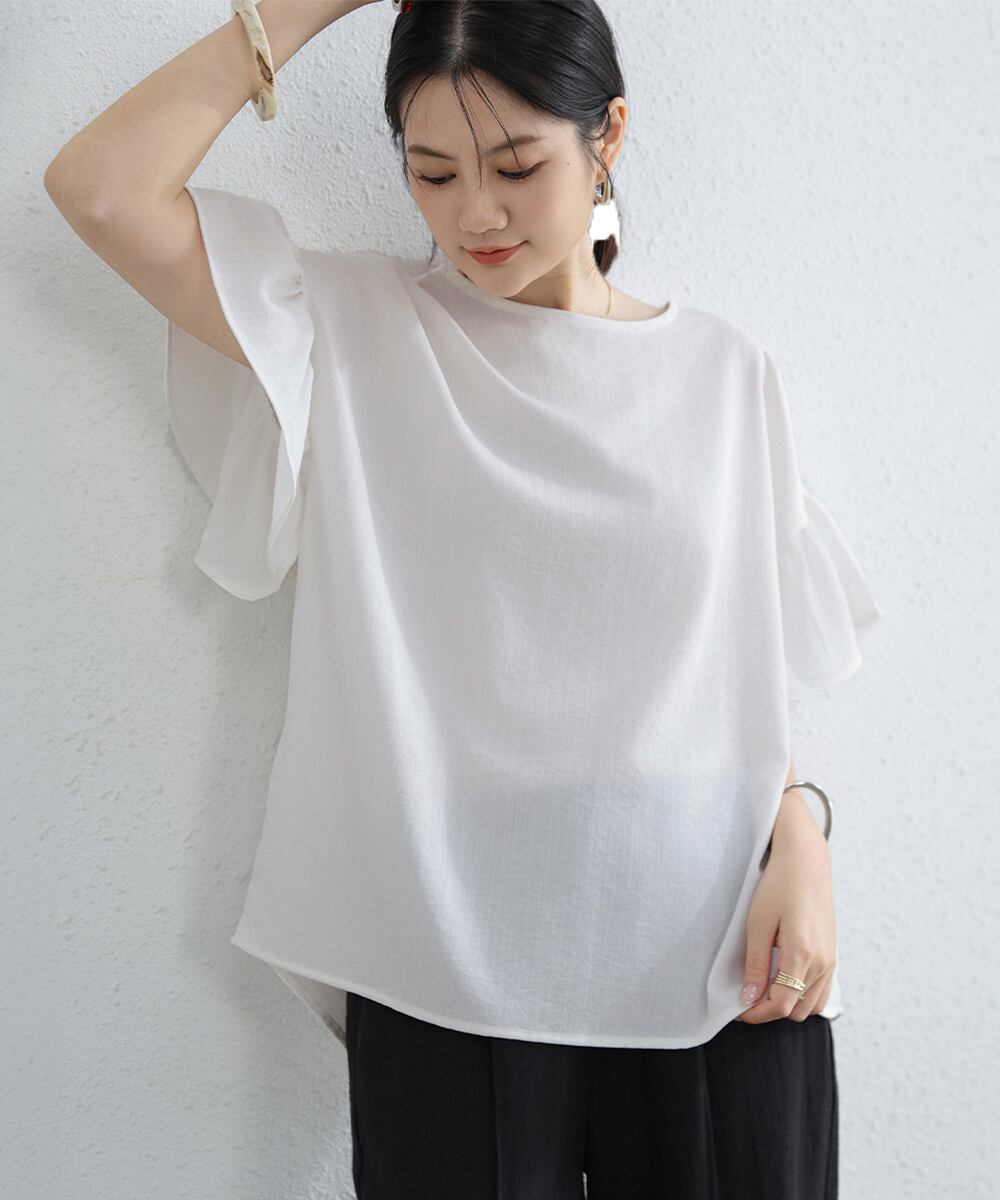 風通しのよいフリルスリーブ、夏の一枚着に最適のカットソー