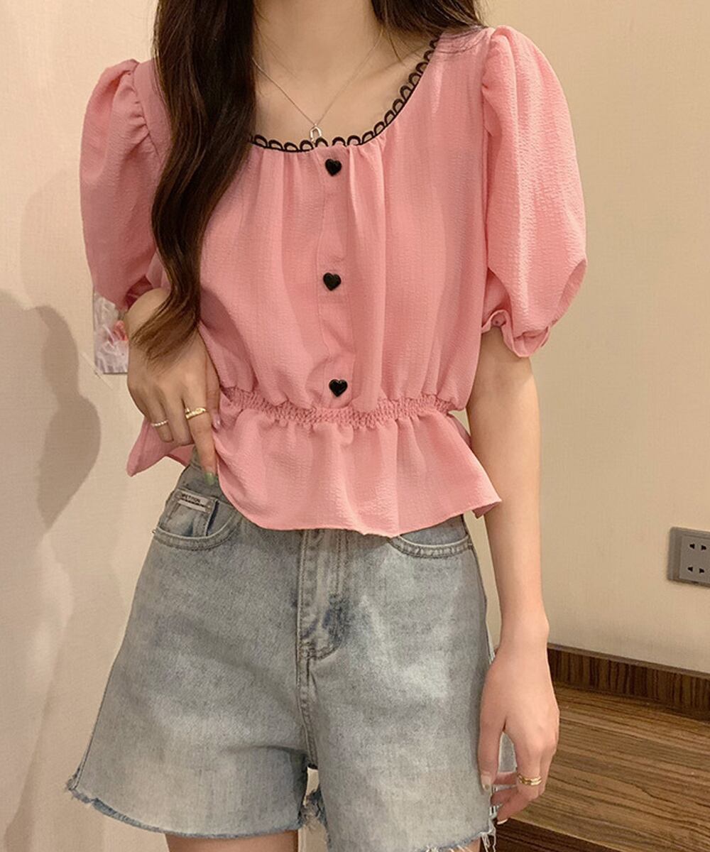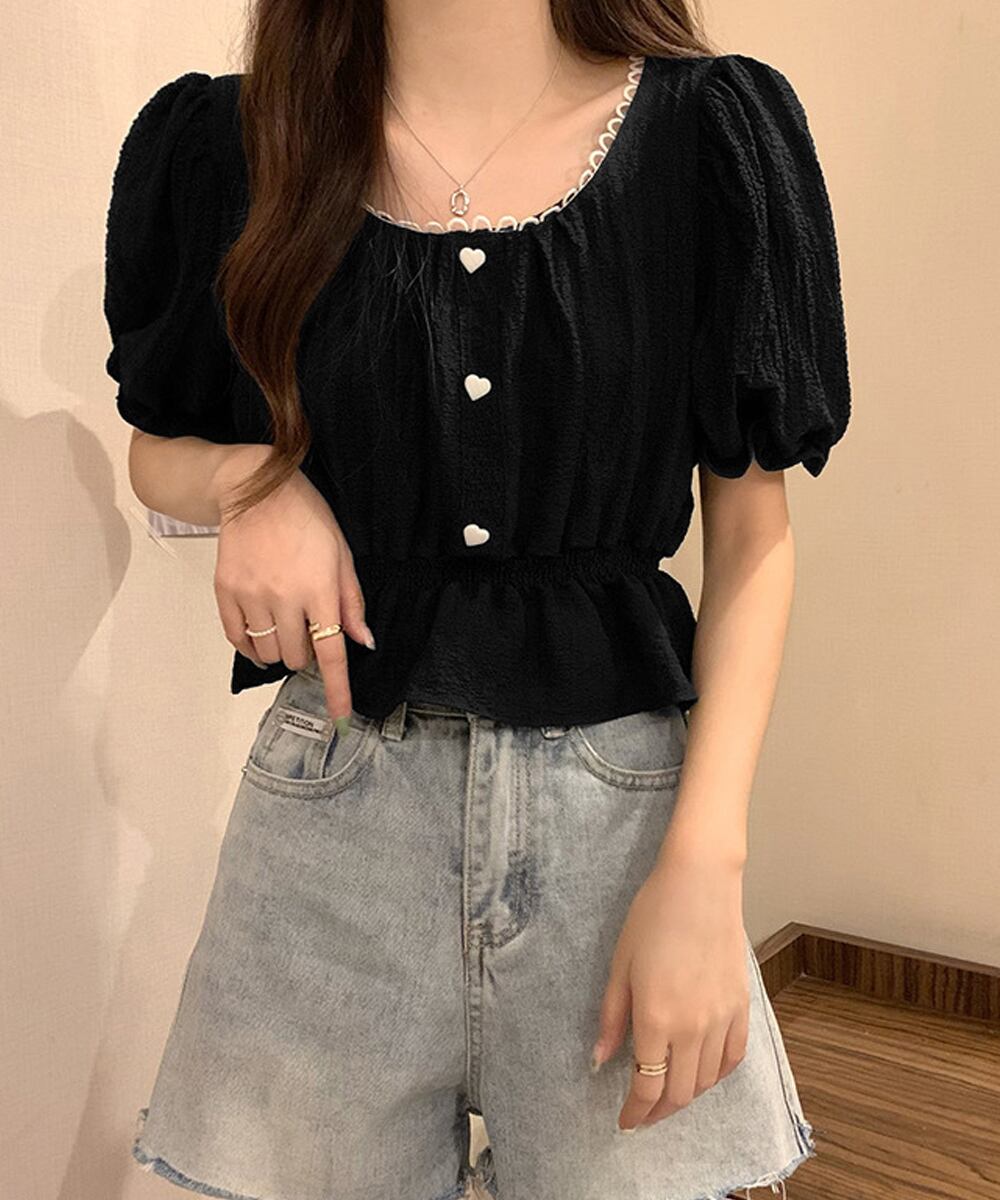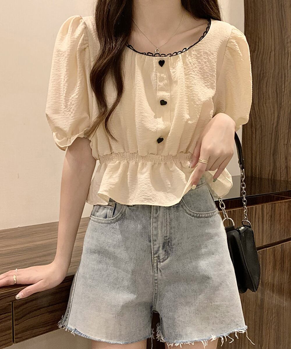 レディース 大人可愛い ショート丈シャツ パフスリーブ フェミニン フリルブラウス きれいめ トップス