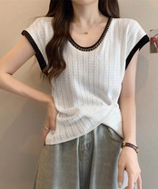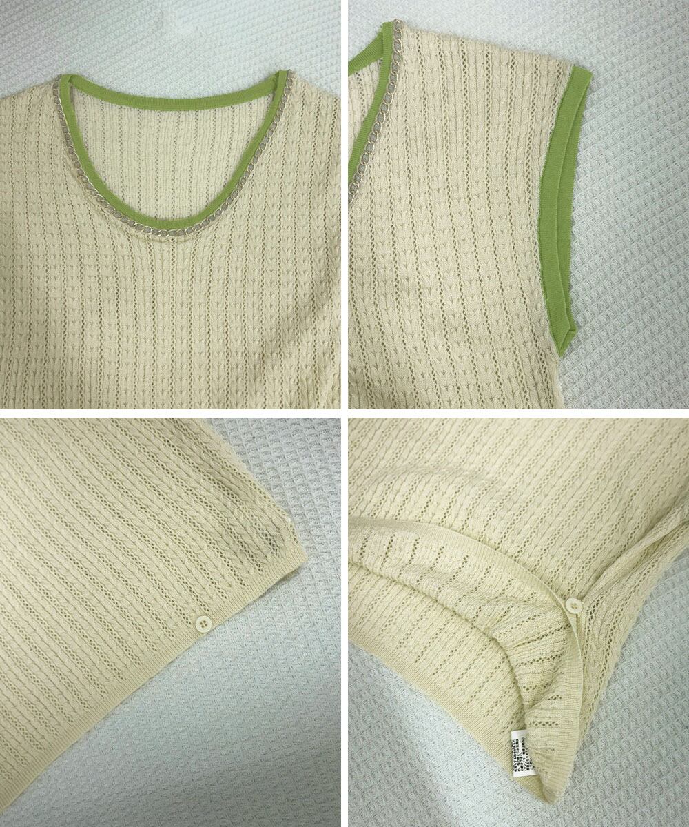 ノースリーブニットトップス きれいめ 配色 春夏トップス 丸首 薄手ニットソー韓国風 カジュアル