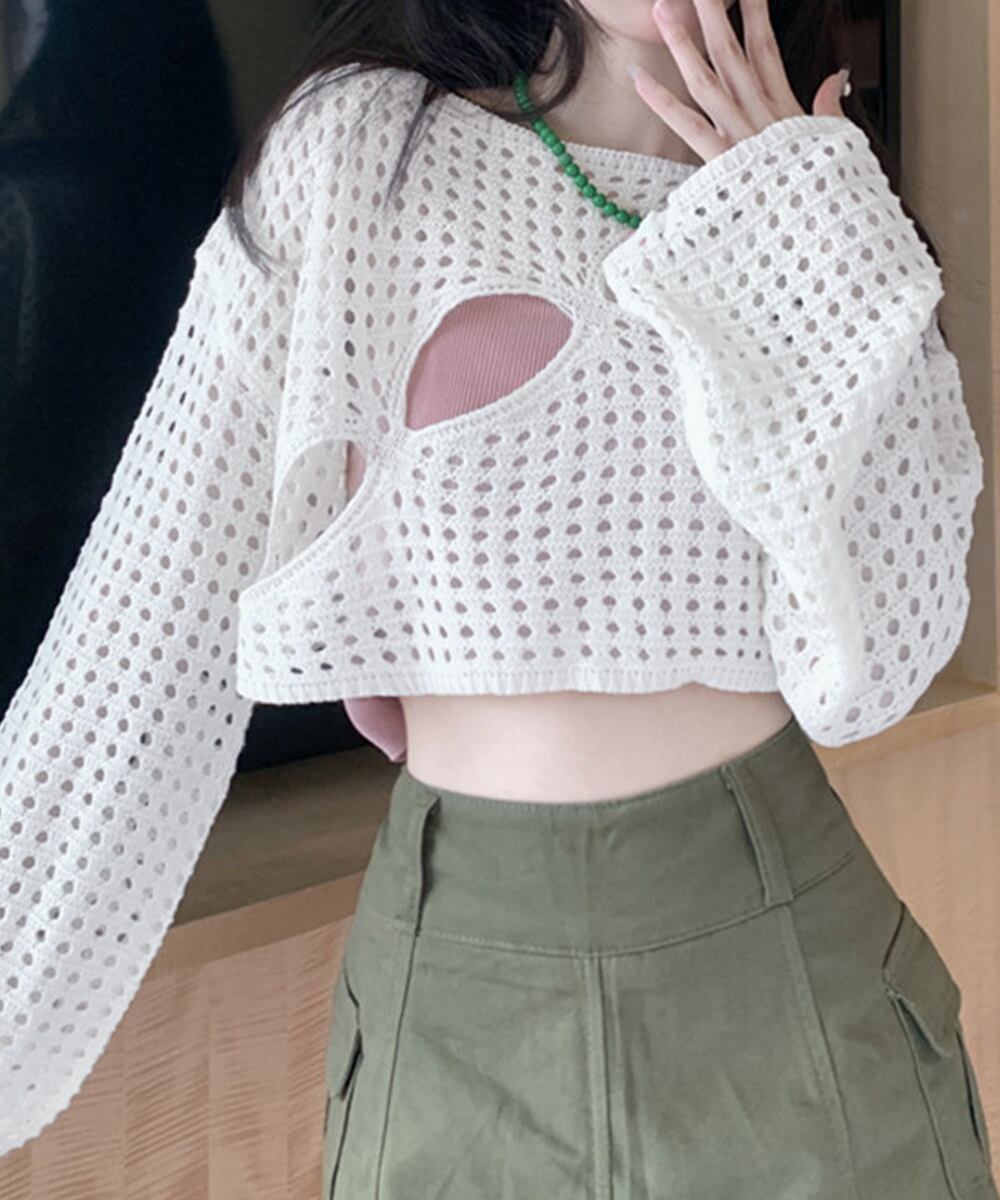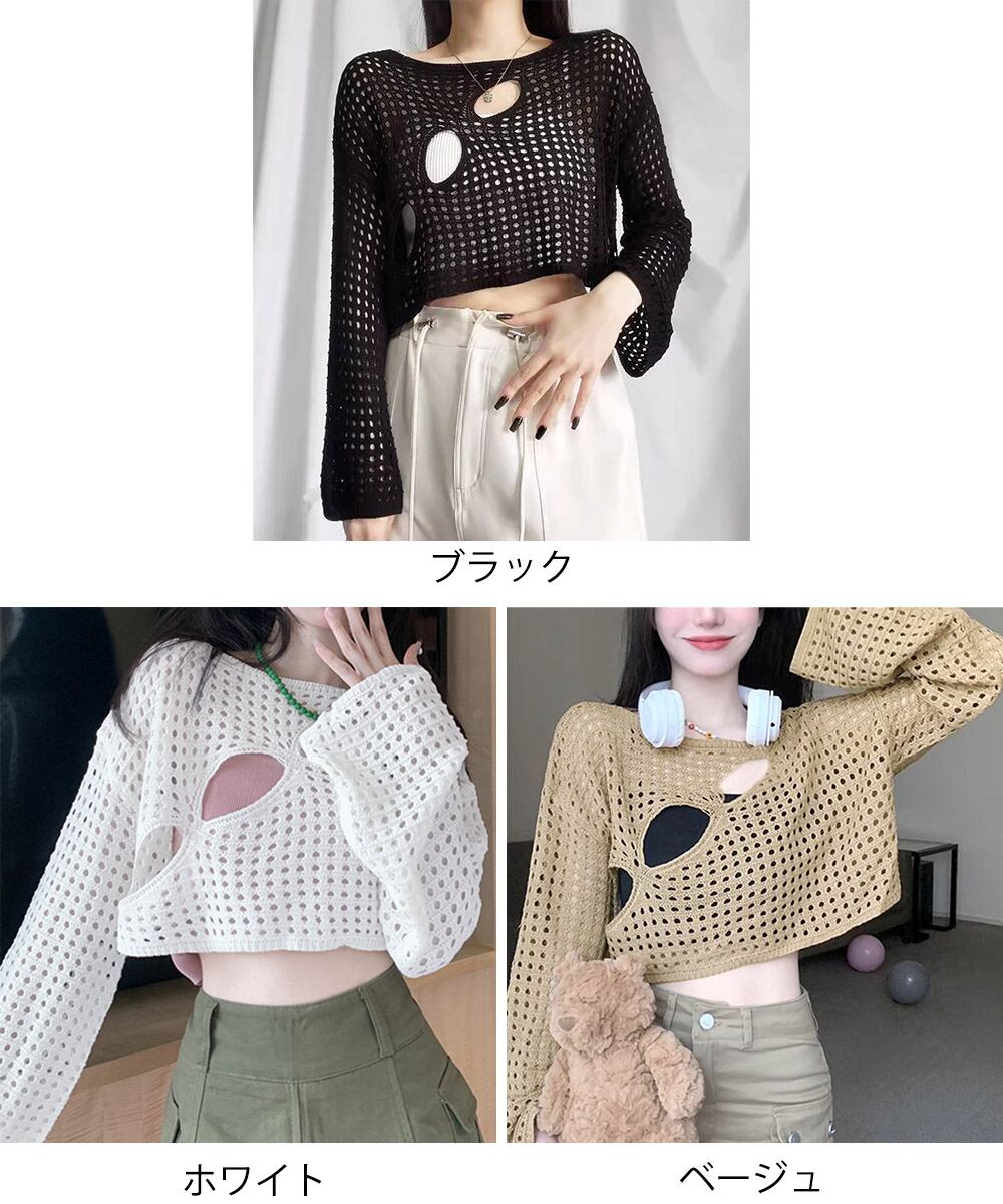 シアーニット 長袖プルオーバー メッシュニット ニットブラウス 重ね着 穴あき加工ニット 肌見せ透け感 ショート丈