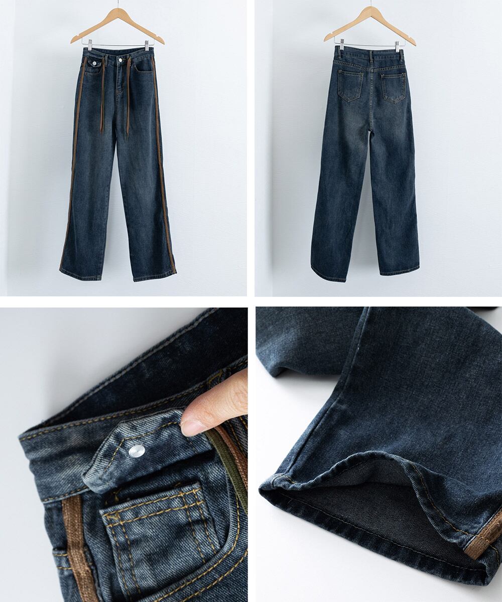 両サイドにはアクセントとしてラインが施されており、シンプルながらもおしゃれなデザインのセミワイドなストレートデニムパンツ