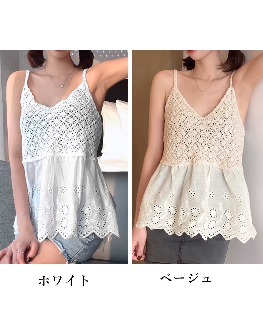 レディース クロシェ編みニットキャミ 切り替え ノースリーブ サマーコーデ 肌見せ 大人可愛い カジュアル 薄手トップス