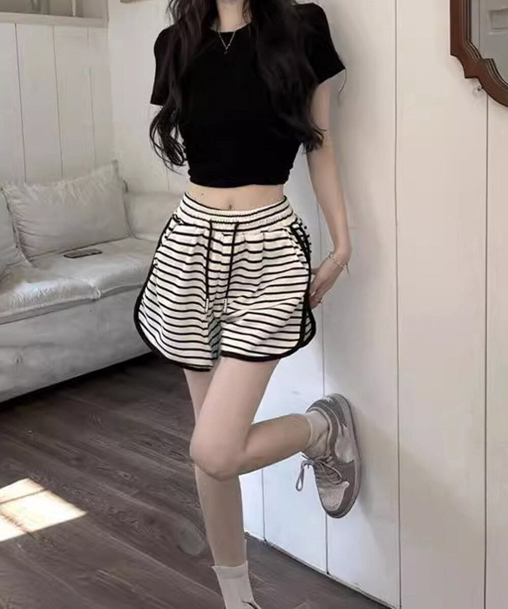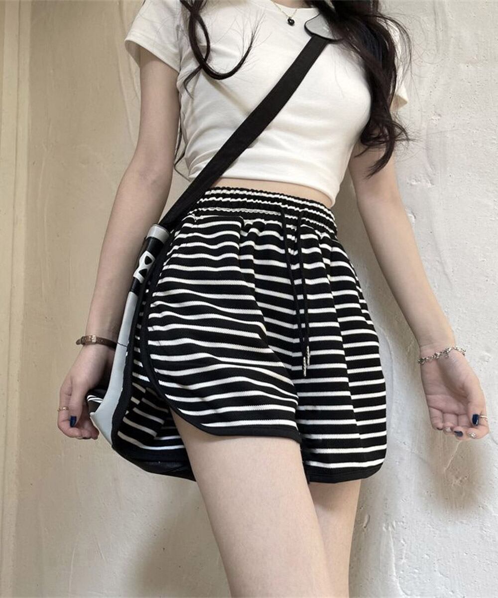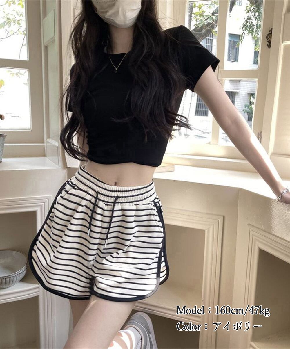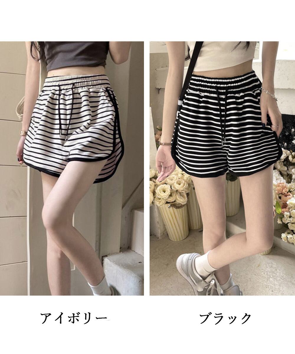 レディース ハイウエスト ボトムス ボーダー柄 大人可愛い ポケット付き 短パン ウエストゴム リラックスパンツ 部屋着