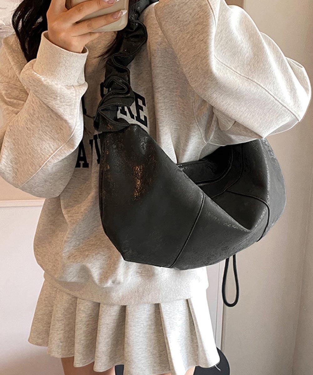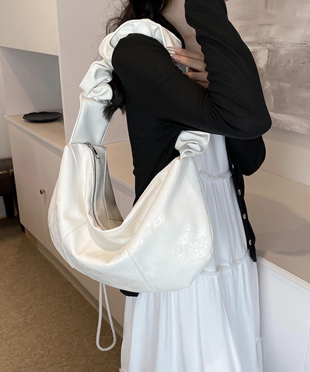 フリルハンドル ワンショルダーバッグ 大容量 ドロストボディバッグ 肩掛けかばん PUレザー軽量 シルバーバッグおしゃれ