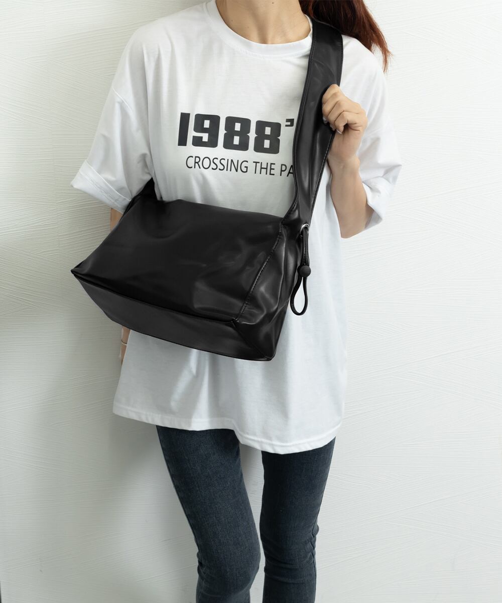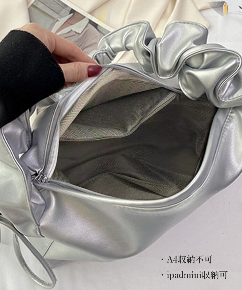 ドロストフリルがスタイリングのポイントになるソフトPUレザーのバッグ