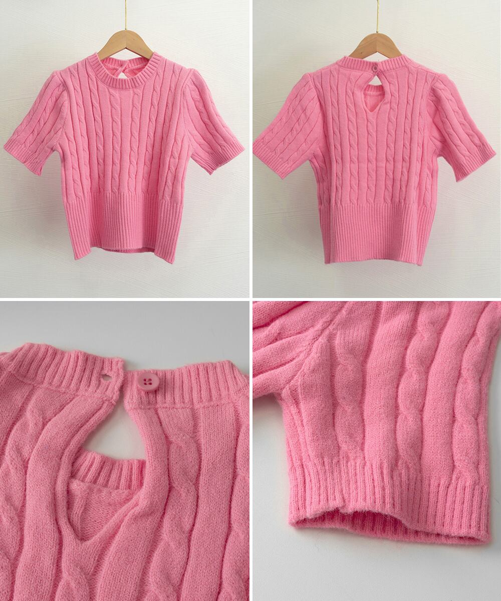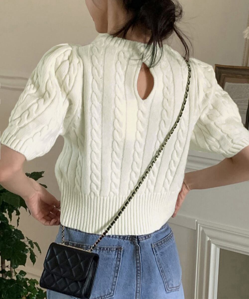 背中が開いたバックスタイルが、洗練された大人の抜け感を演出するケーブル編みのニットトップス