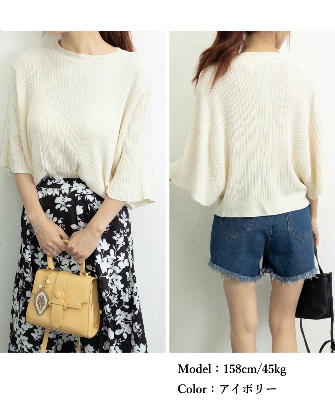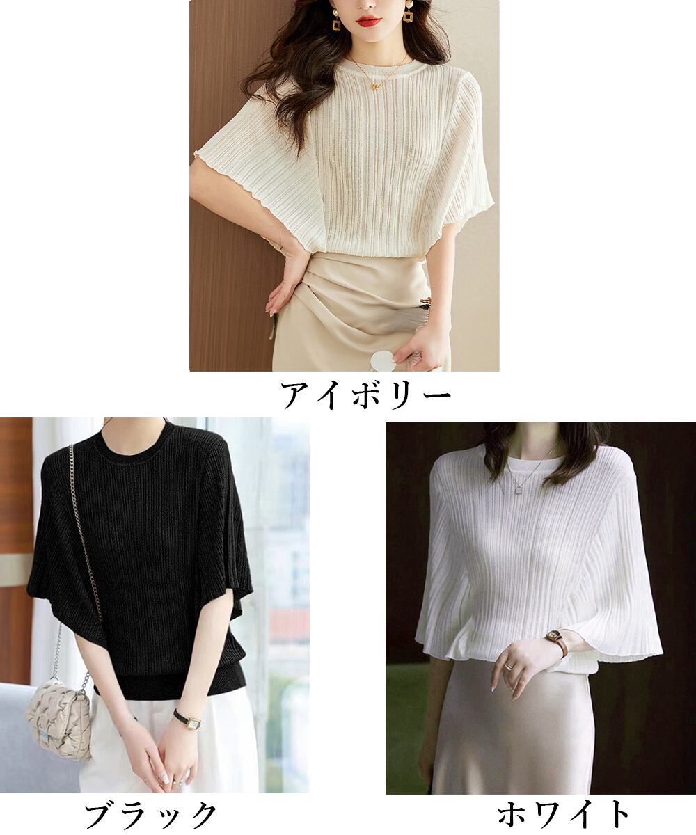 半袖サマーニット 冷感タッチ ニットブラウス 上品きれいめ ニットTシャツ オフィスカジュアル 華奢見えドルマンスリーブ