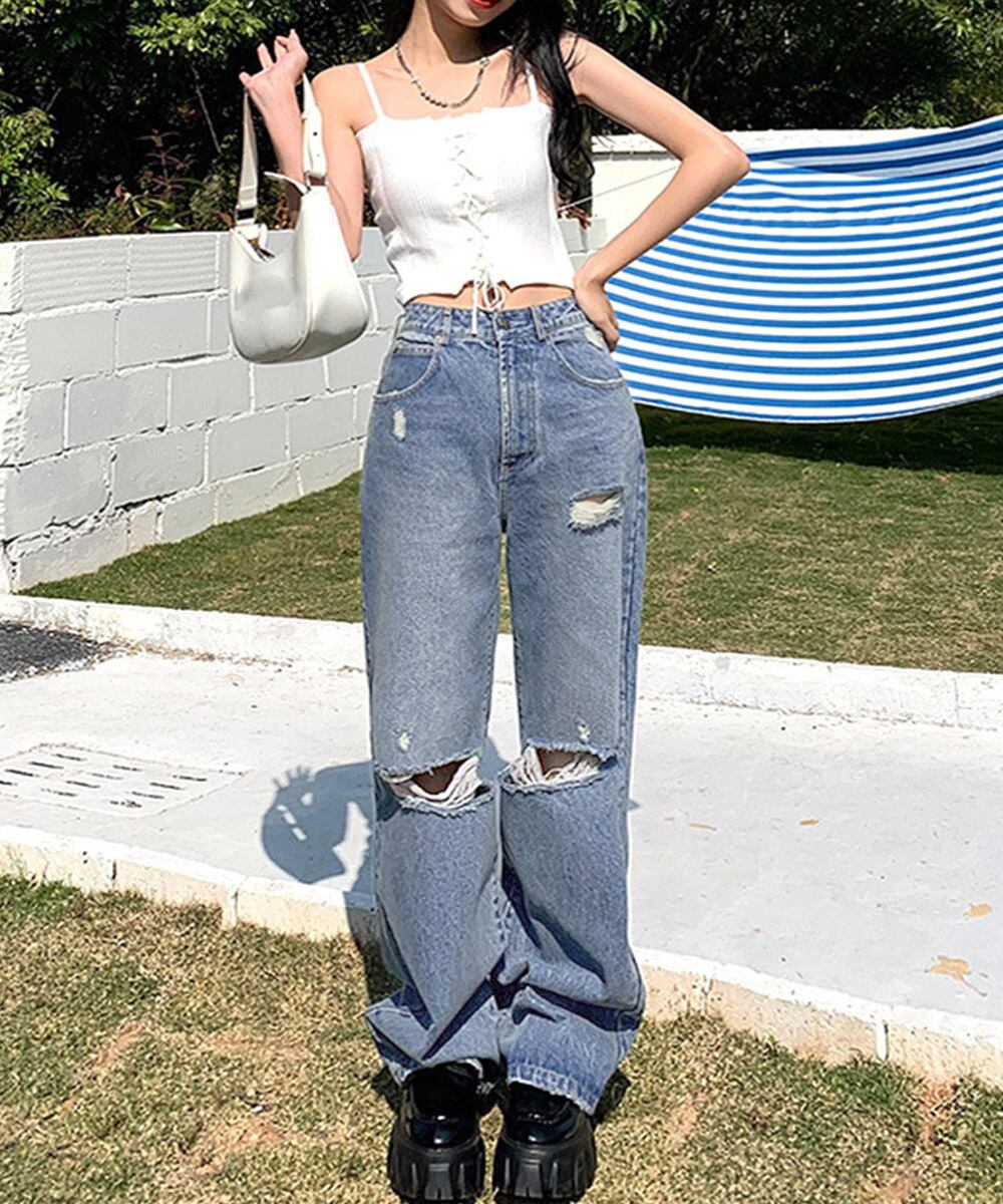 トレンド感溢れるダメージ加工が特徴のデニムストレートパンツ