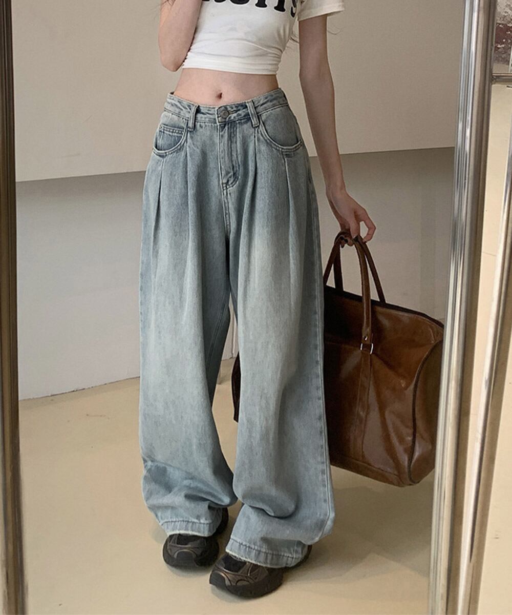 タックワイドデニムパンツレディース韓国風