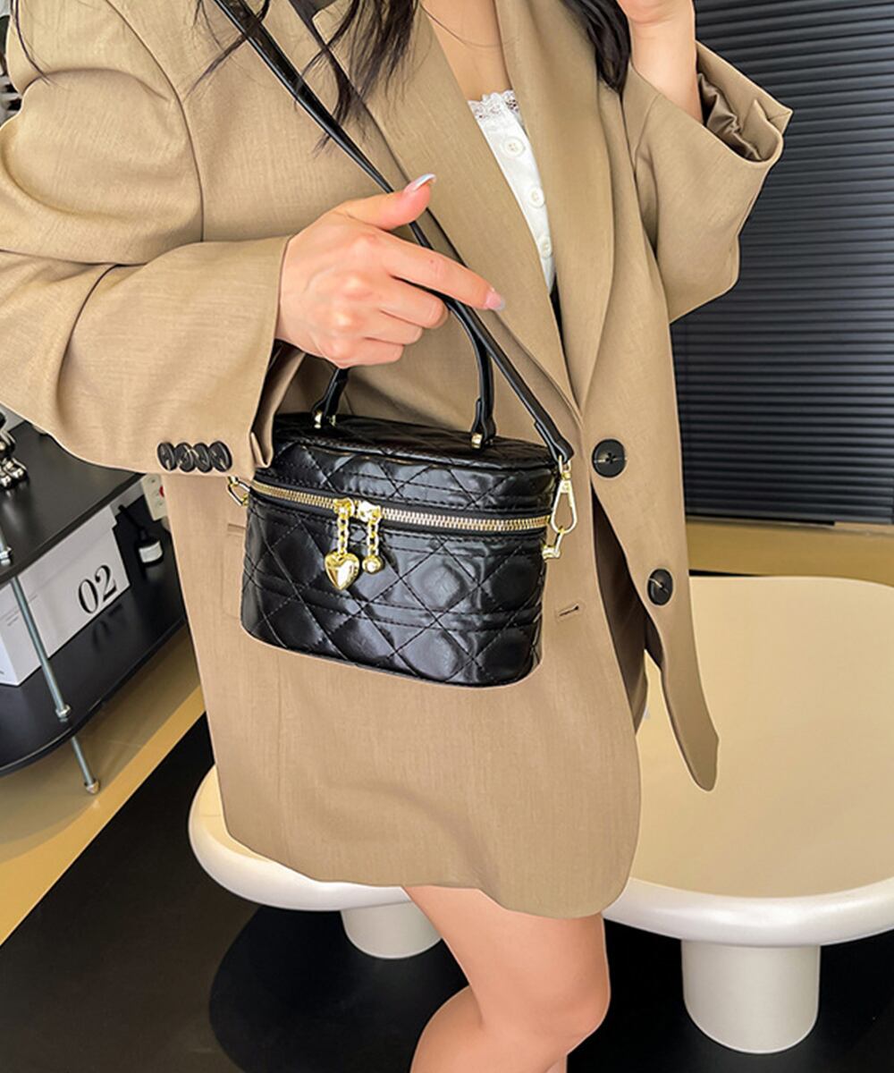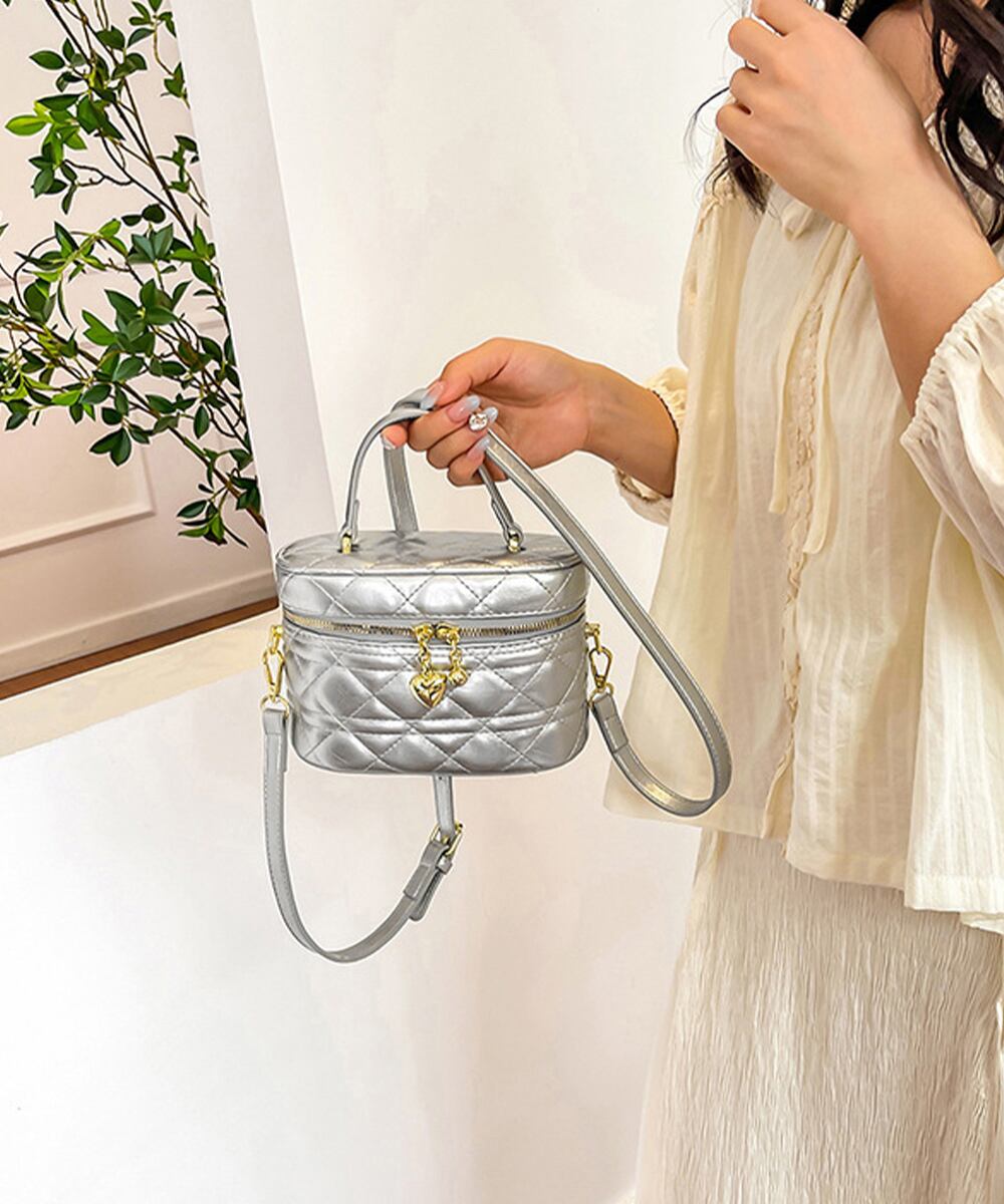 全体にキルティング加工が施され、ゴールドの金具とハートのチャームがアクセントに
