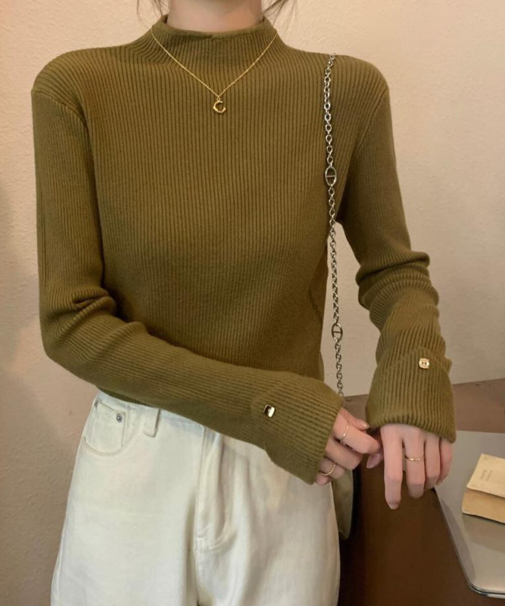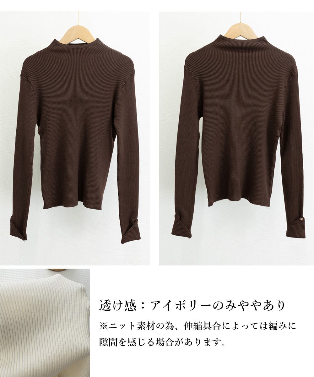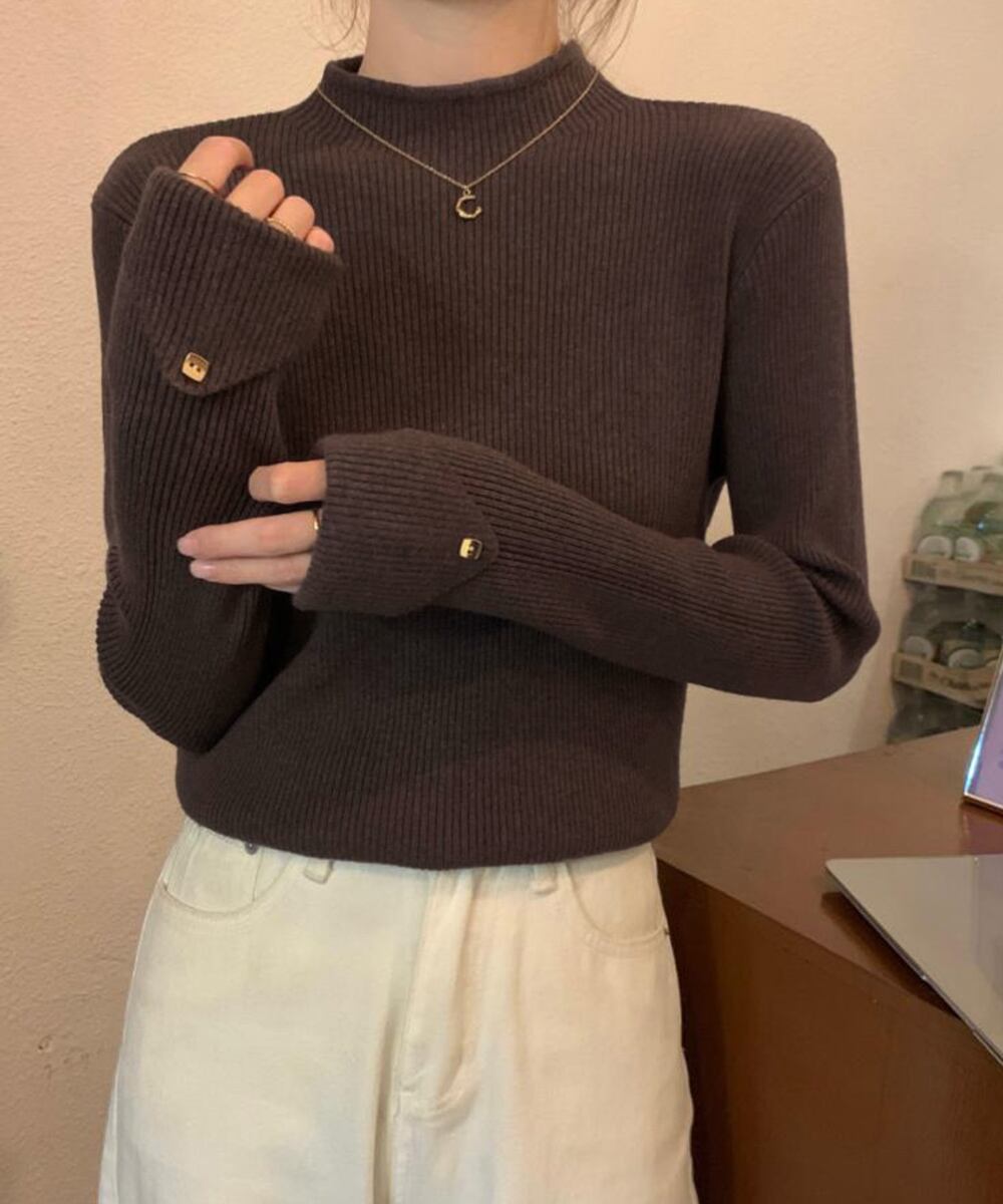 プチハイネックニットトップス 袖口ボタン
