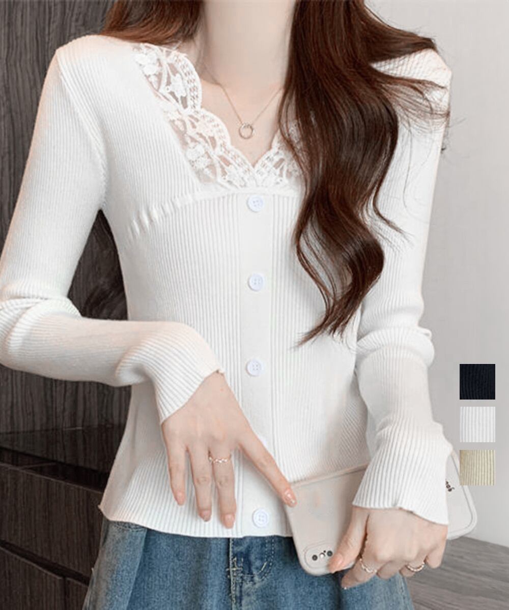 首元はVネックで、レースの切り替えがさりげないアクセントに