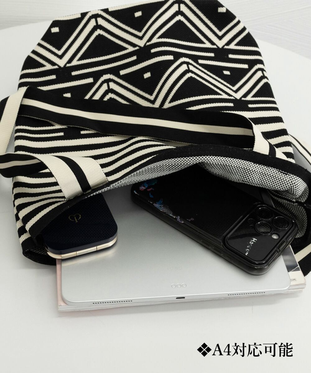 スタイリングに映えるデザインが目を引くニット素材のマルシェトートバッグ