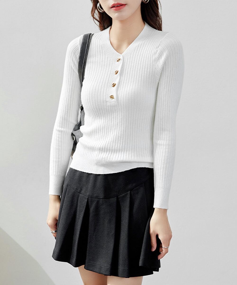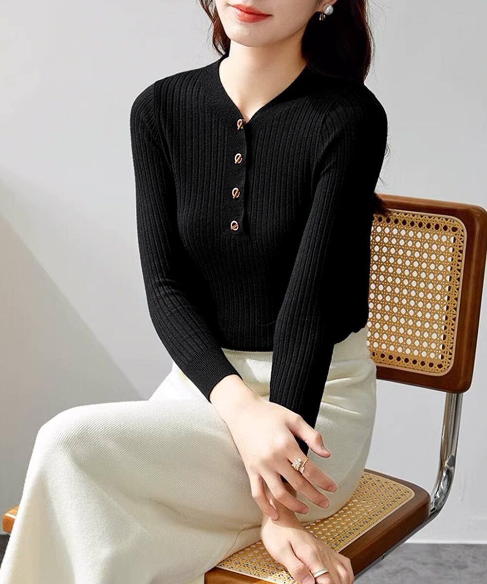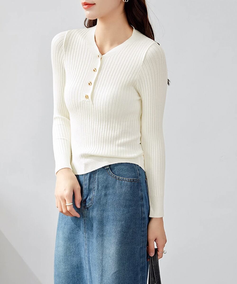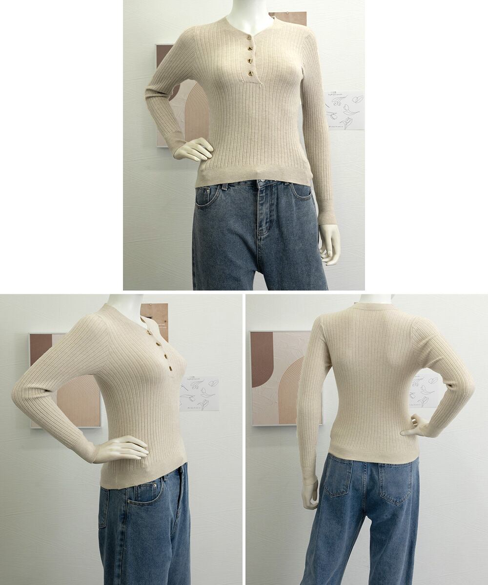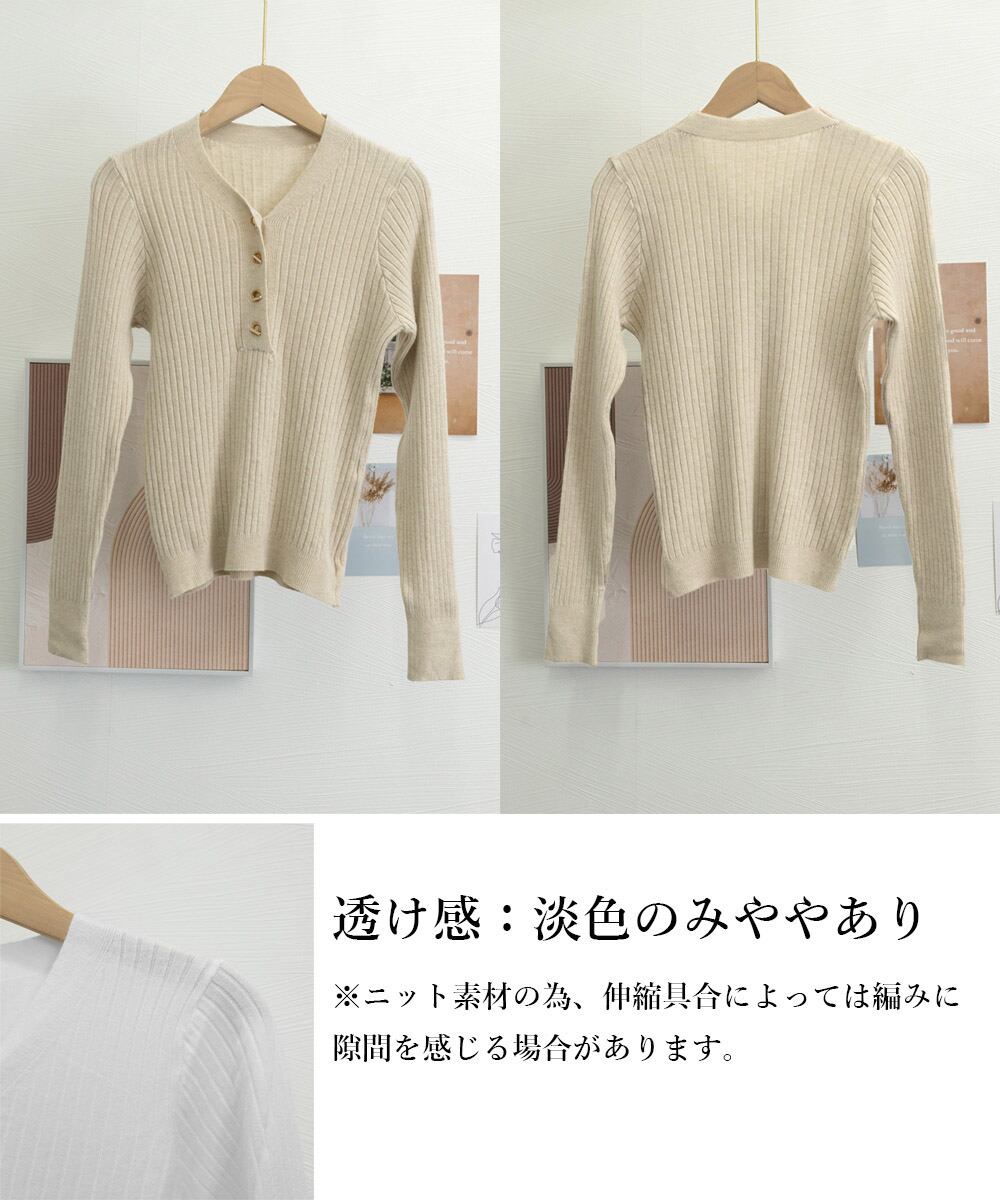 リブ編みのデザインが程よいフィット感を提供し、体のラインを美しく見せるニットトップスです。
