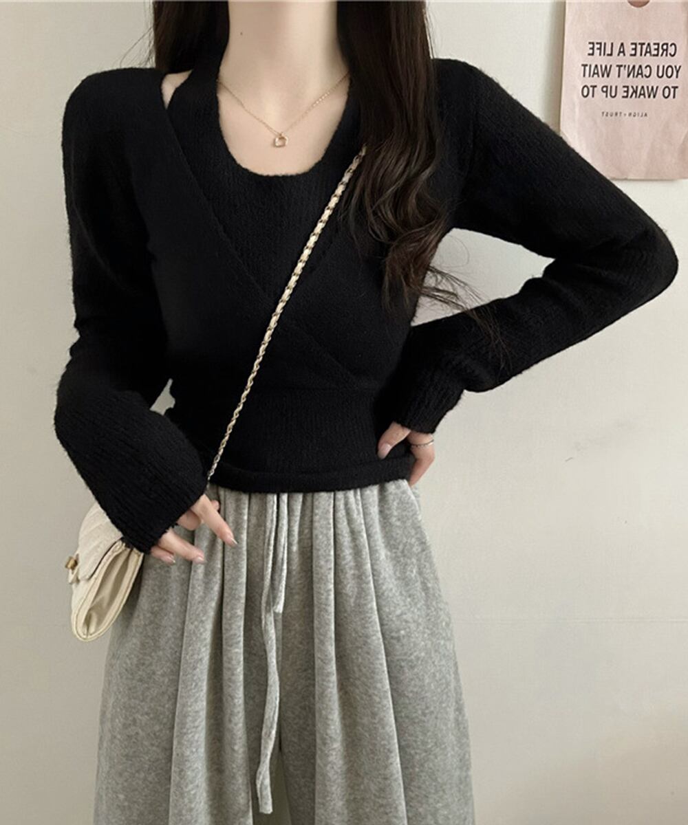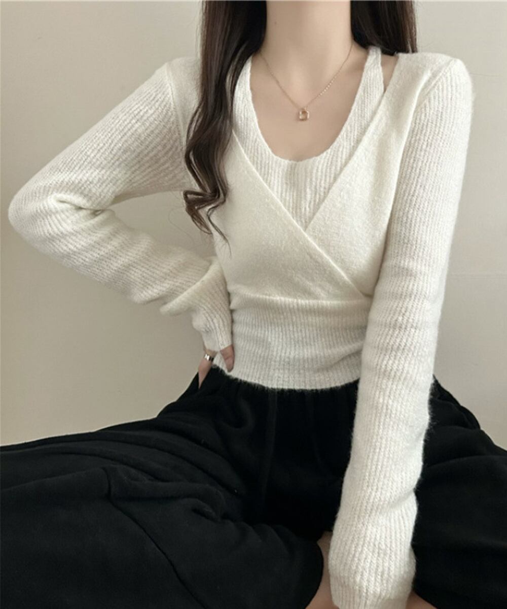 柔らかい素材感とエレガントなカシュクールデザインが特徴のレイヤード風ニットトップスです。