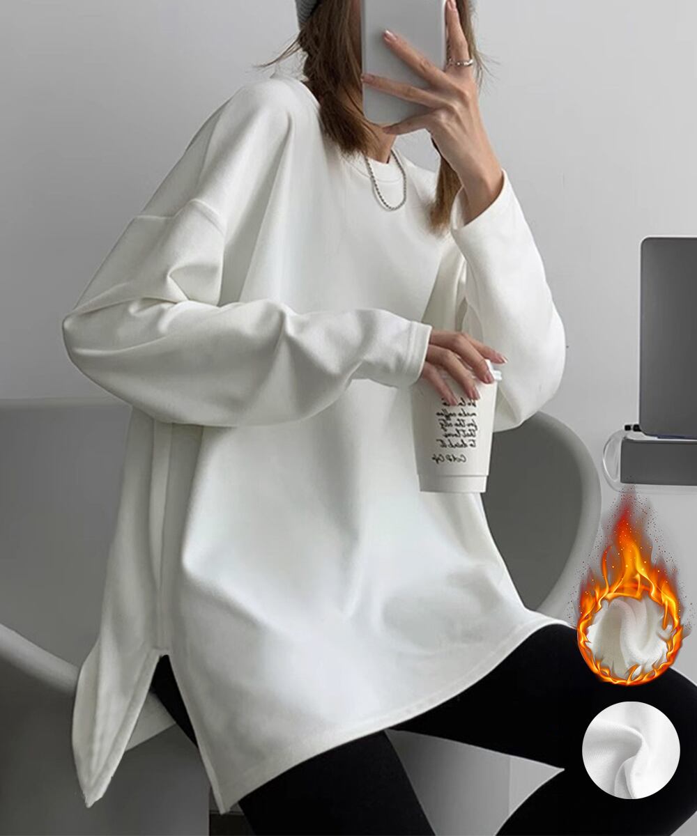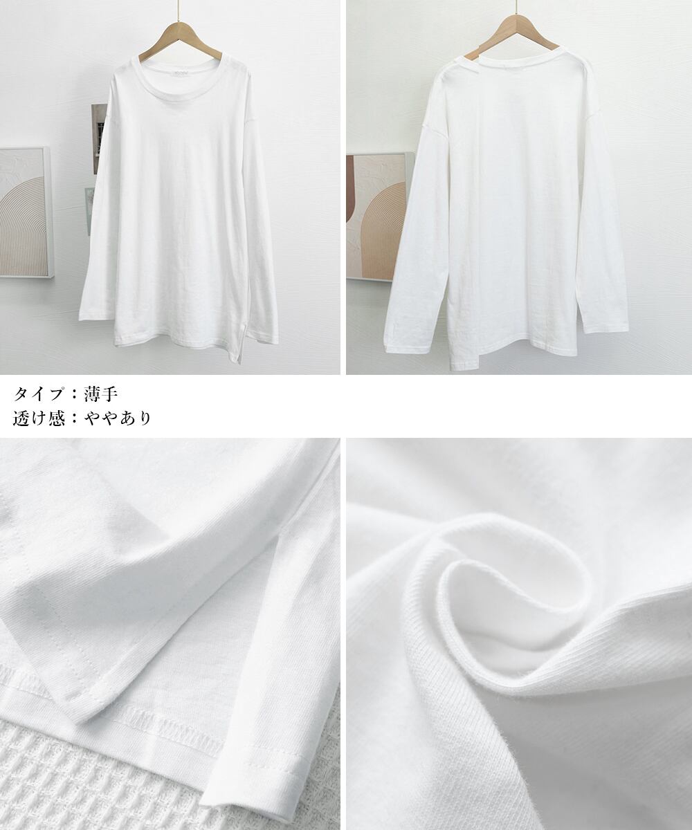 暖かい サイドスリットTシャツ ゆったり ドロップショルダートップス 無地長袖白Tシャツ 韓国風カットソー 着回し春秋冬
