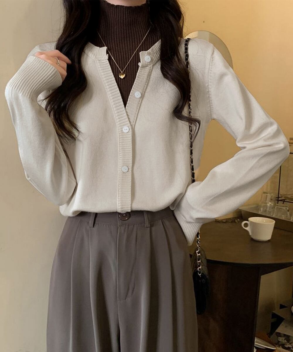 飾りボタン付きで、カーディガン風のレイヤードスタイルも簡単に楽しめます。