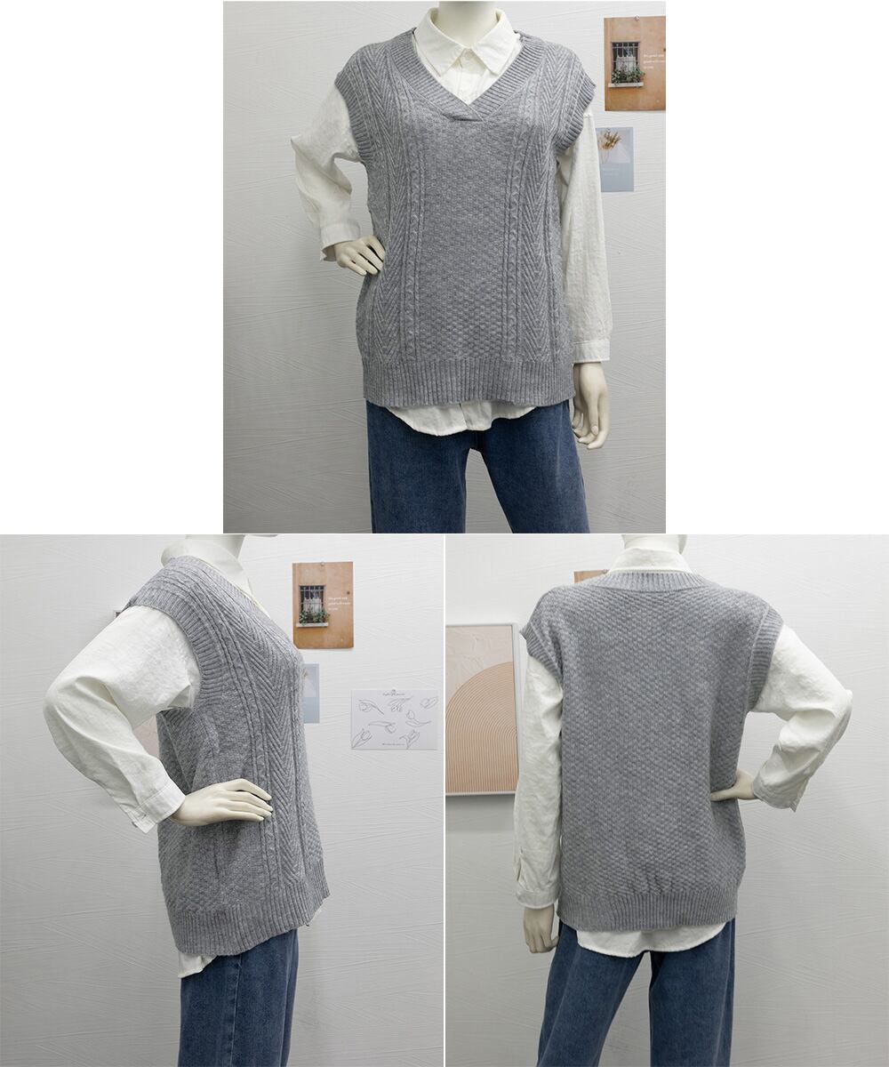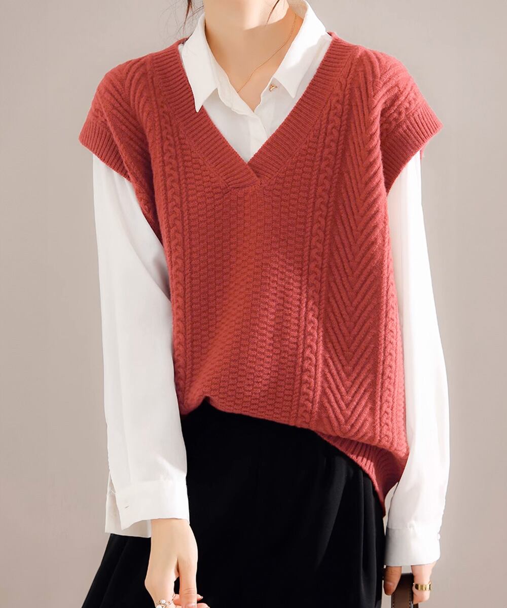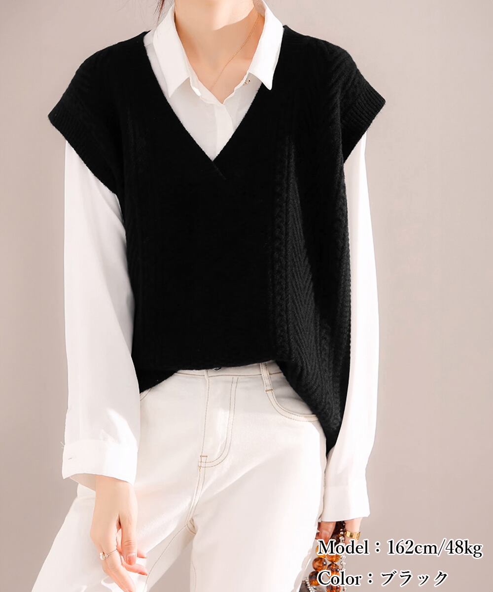 ケーブル編みデザインがアクセントになり、シンプルなコーディネートでも存在感を発揮するニットベスト。