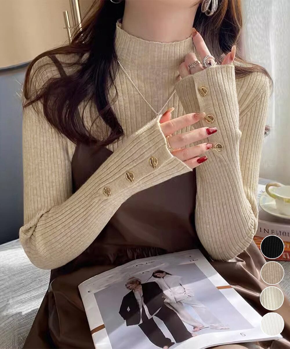 韓国風 大人きれいめ ニットセーター 無地 ニットインナー 袖ボタンニットカットソー オフィスカジュアル チクチクしない
