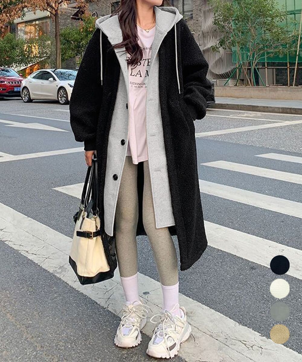 まるで中にパーカーを着ているかのようなレイヤードスタイルのボアロングコート