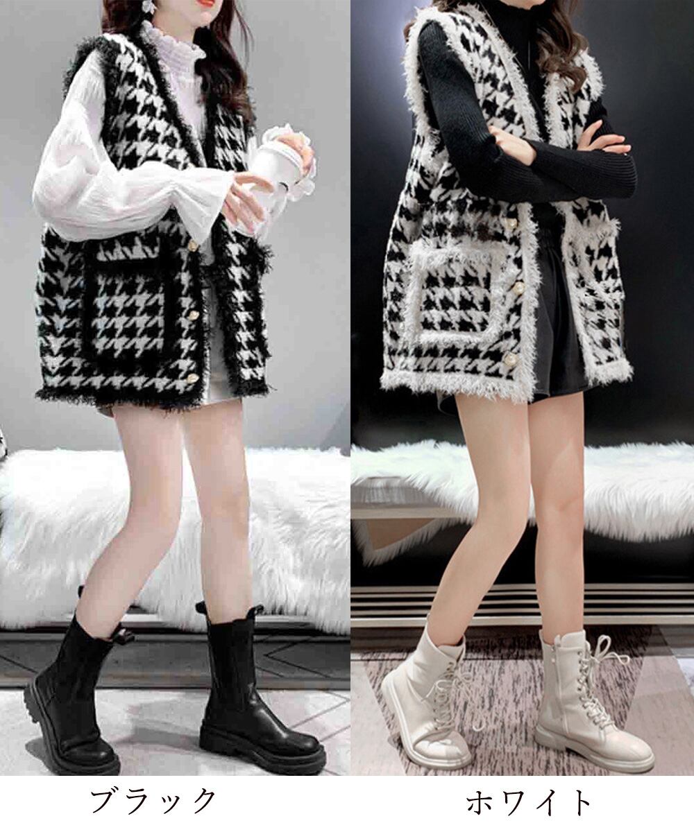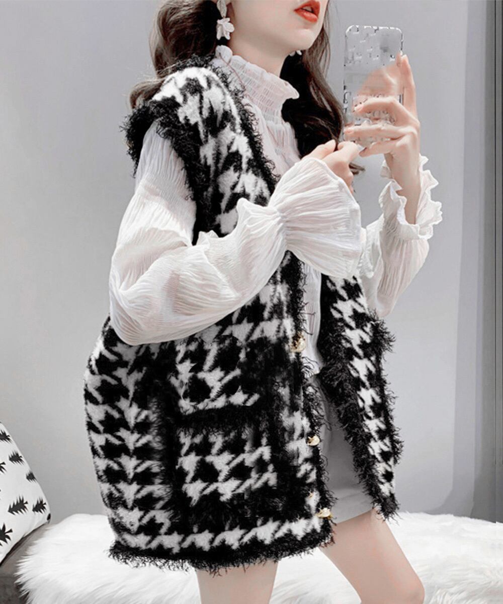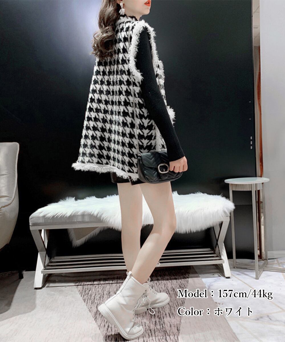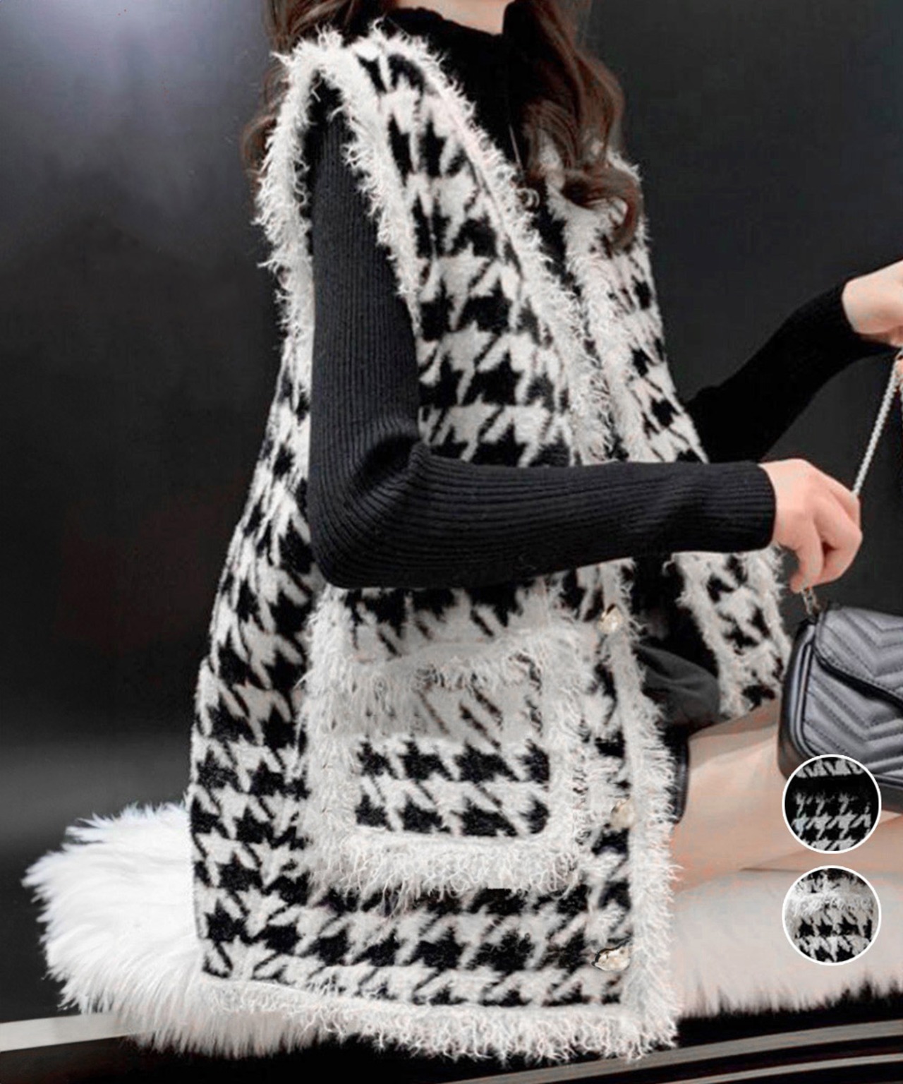 モノトーンの千鳥格子柄が、大人っぽさと上品さを演出し、幅広いスタイルに合わせやすいファッションベスト