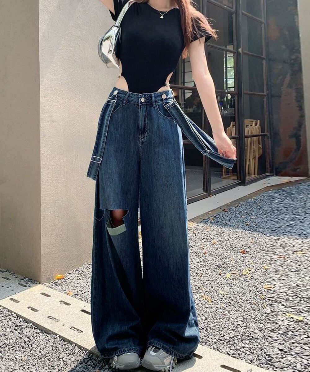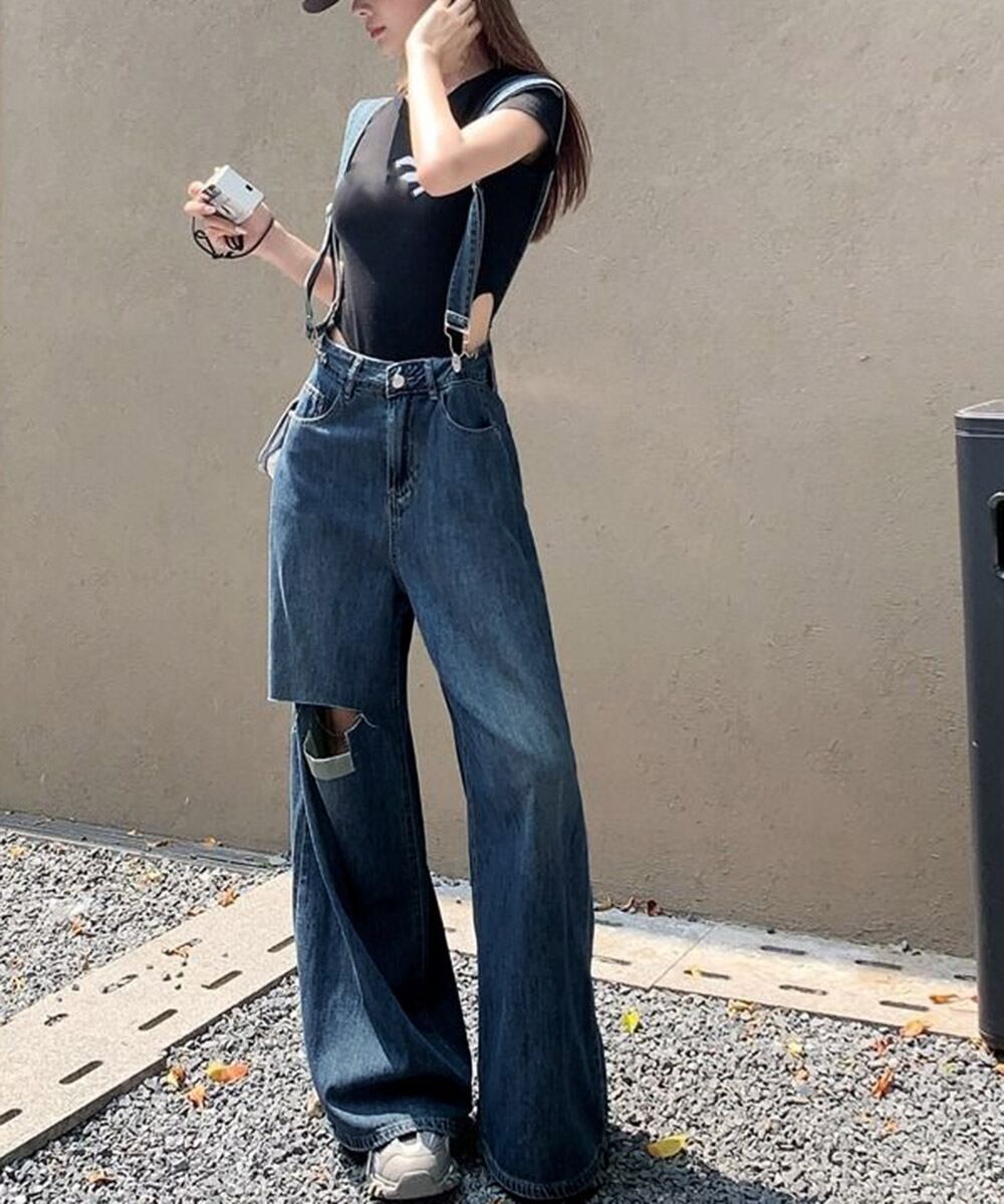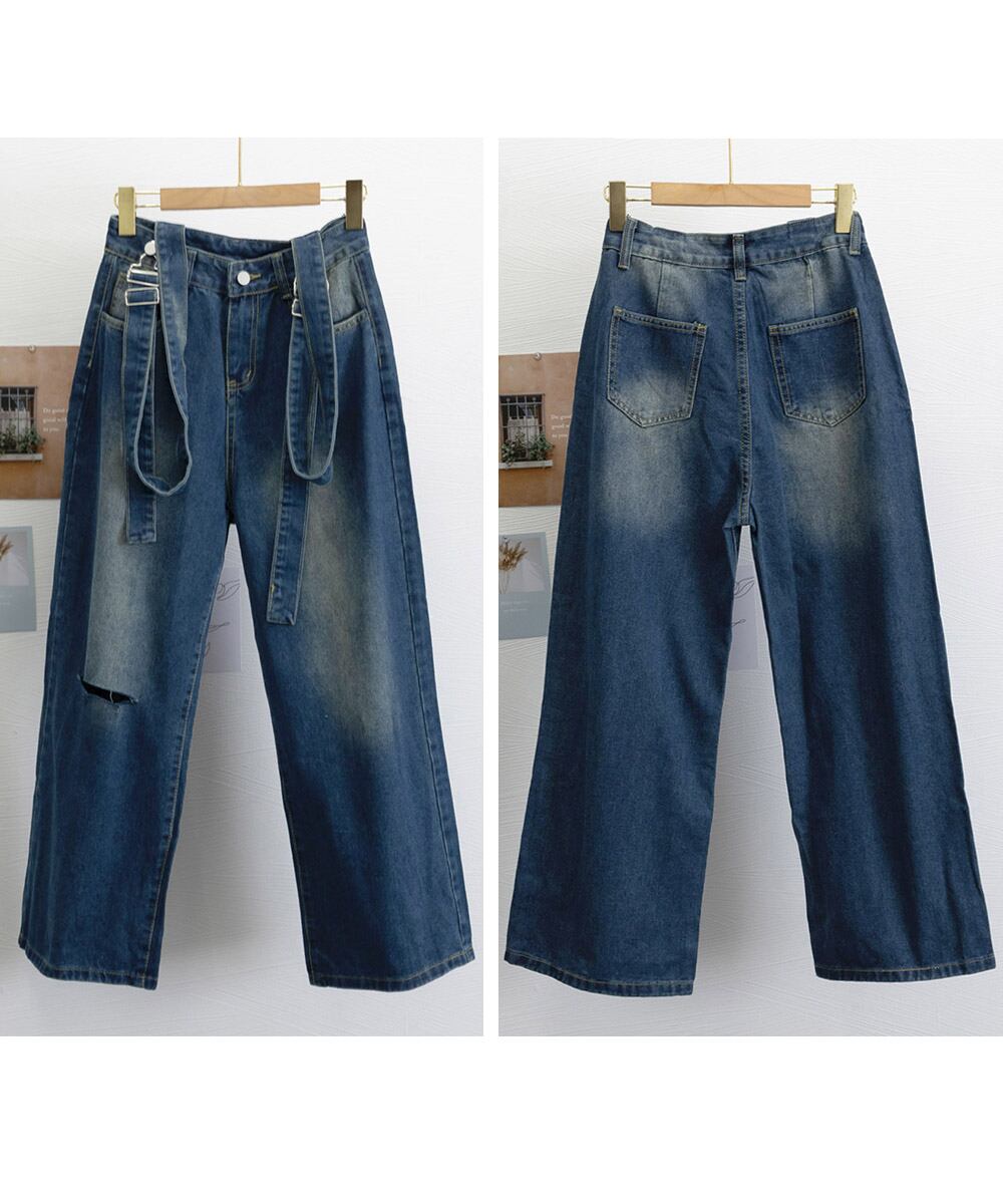 ロングパンツ レディース ストレートパンツ フロントダメージ カジュアル 4サイズ バギーパンツ サスペンダー 脚長