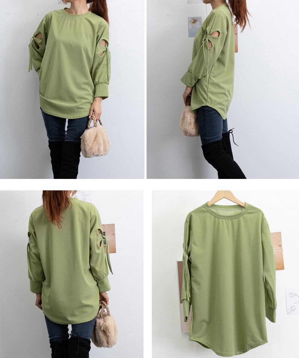 袖のリボンデザインが、さりげなくおしゃれな雰囲気をプラスするTシャツカットソー