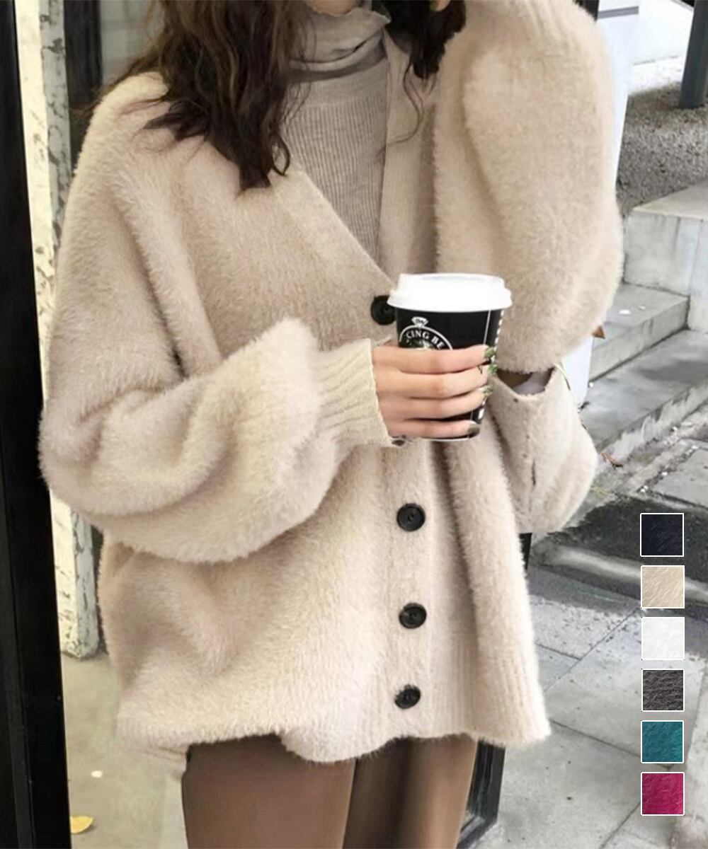 ルーズに羽織ってリラックス感のある着こなしを楽しめるシャギーニットカーディガン