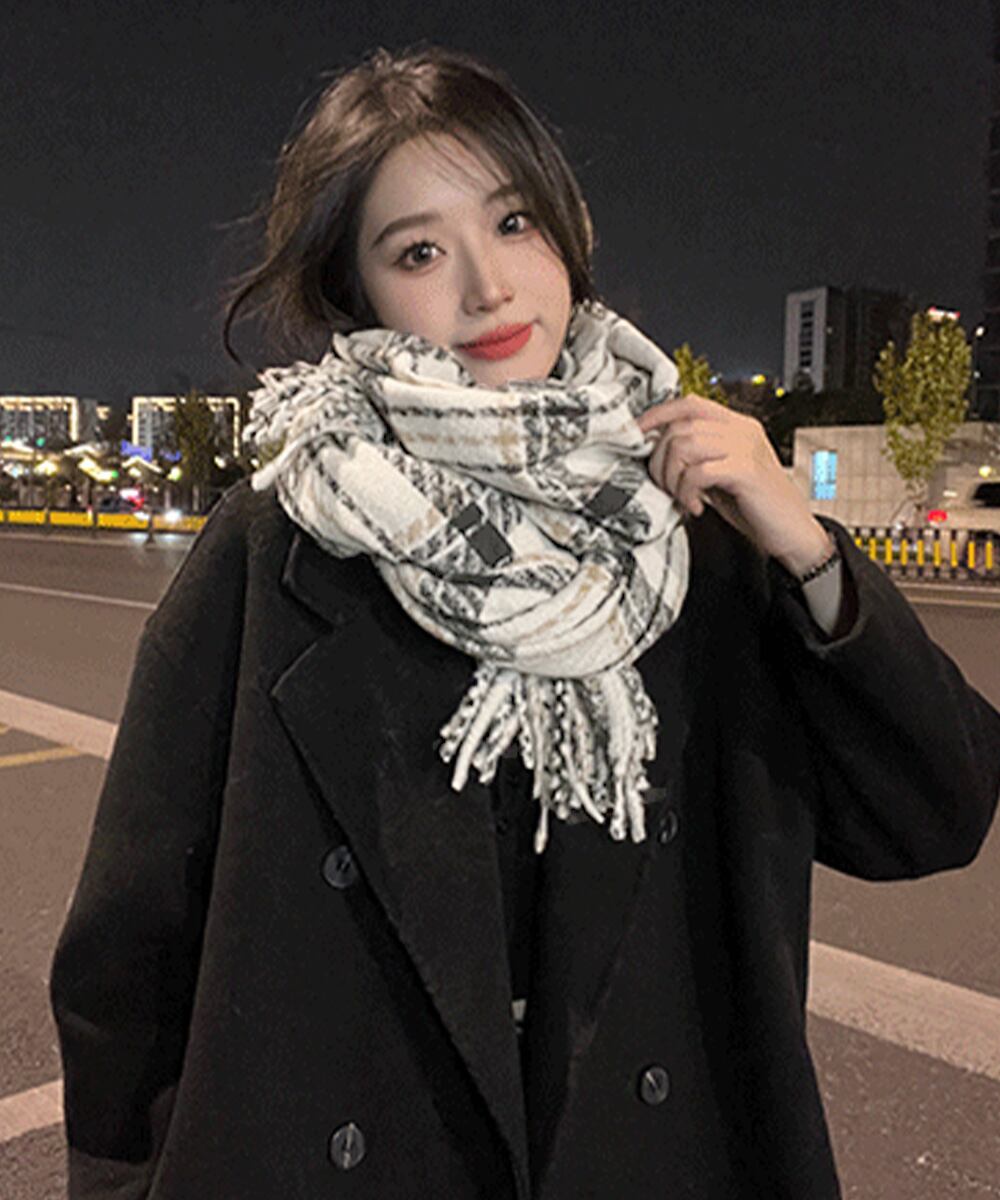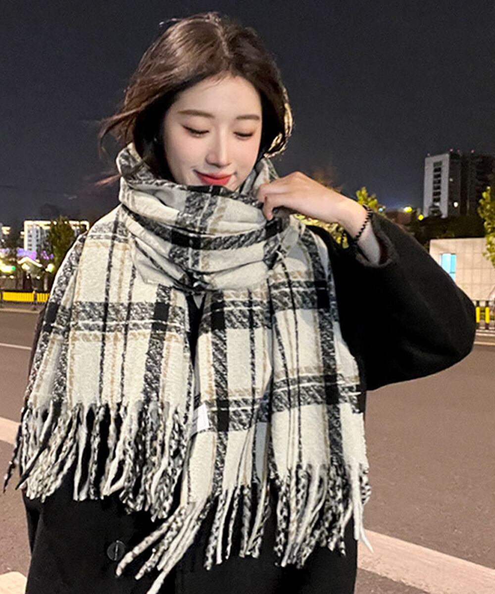 スタイリングのアクセントになるフリンジ付きチェック柄ストールです。