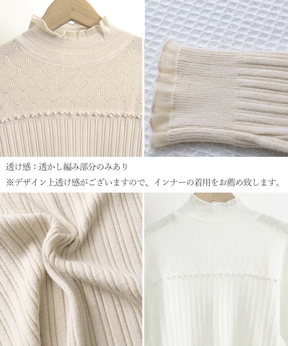 ニットセーターレディース メロウフリルニット パール付きベーシックニットインナー着回し重ね着 レース切替 チクチクしない