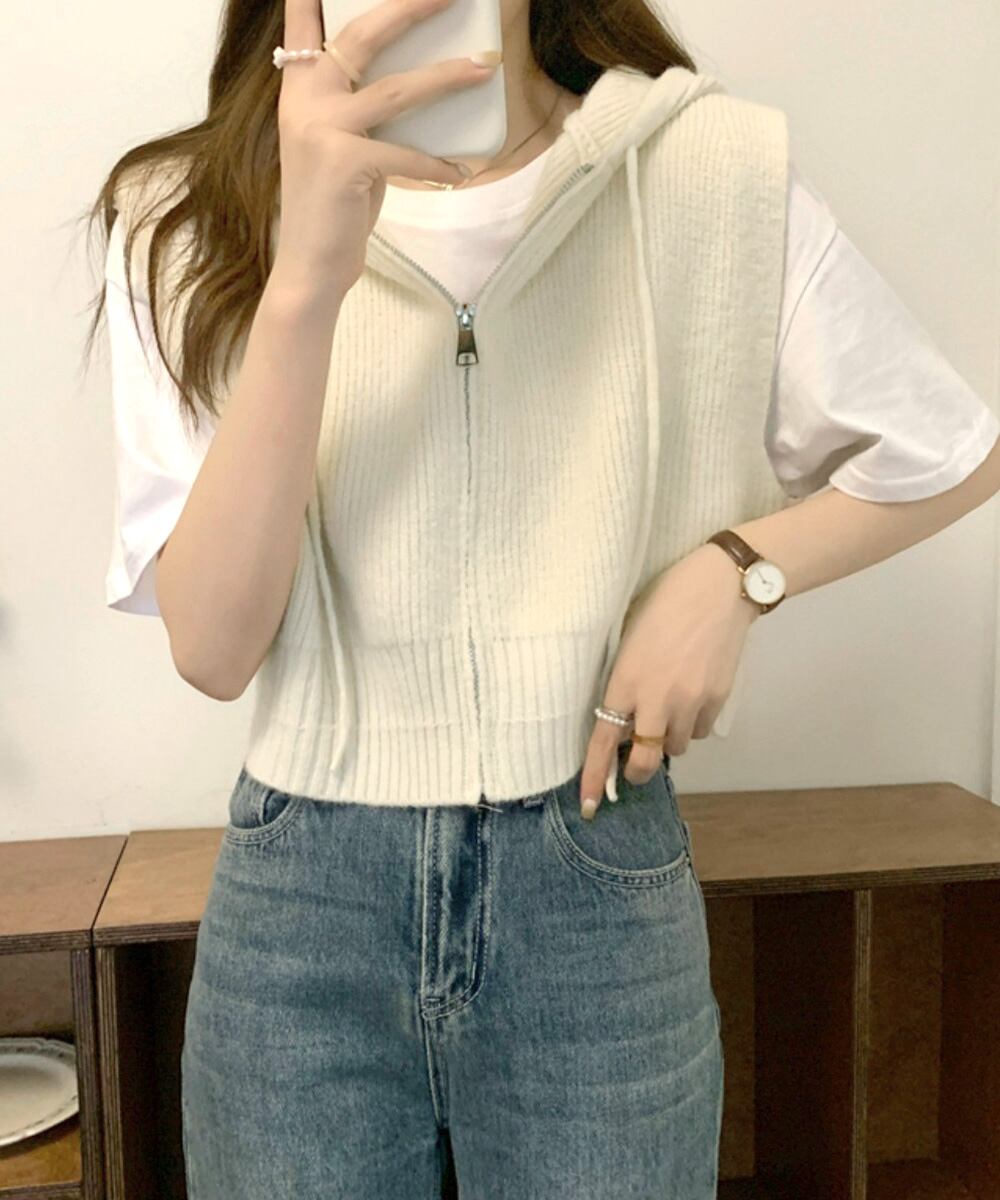 フード付きジップニットベスト ショート丈