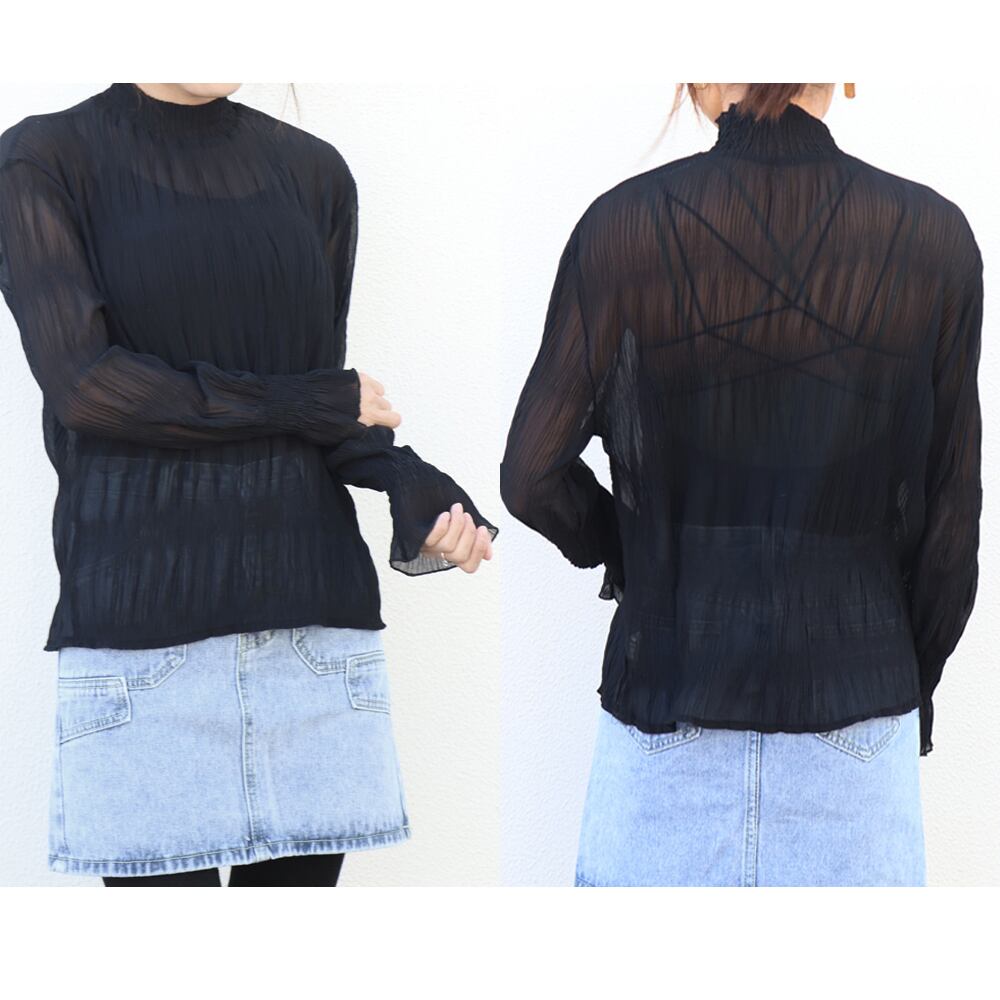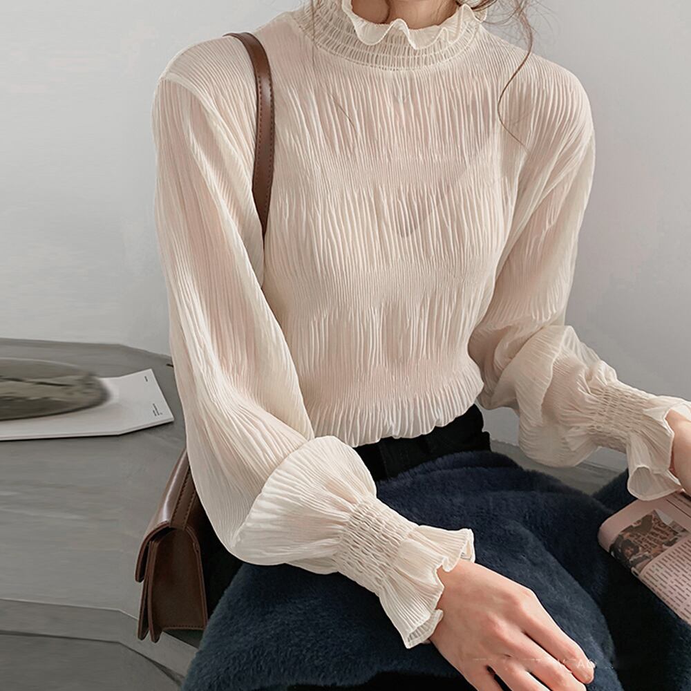 優しい印象でおしゃれな、プチハイネックのギャザーシースルーブラウス