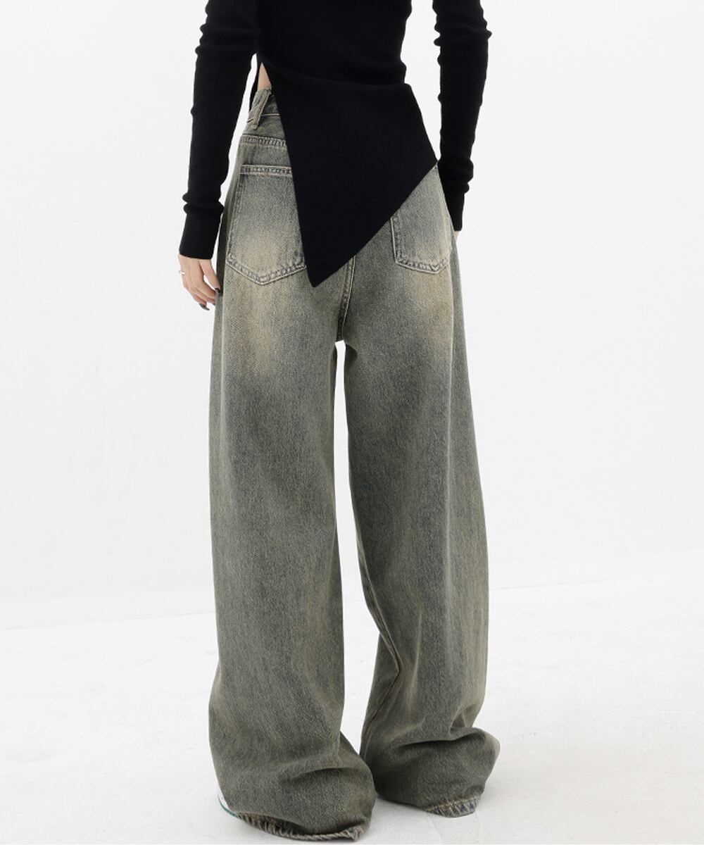 レディース ウォッシュ加工 ルーズデニム 色落ちジーンズ アメカジ 古着ファッション カジュアル ワイドパンツ 長ズボン