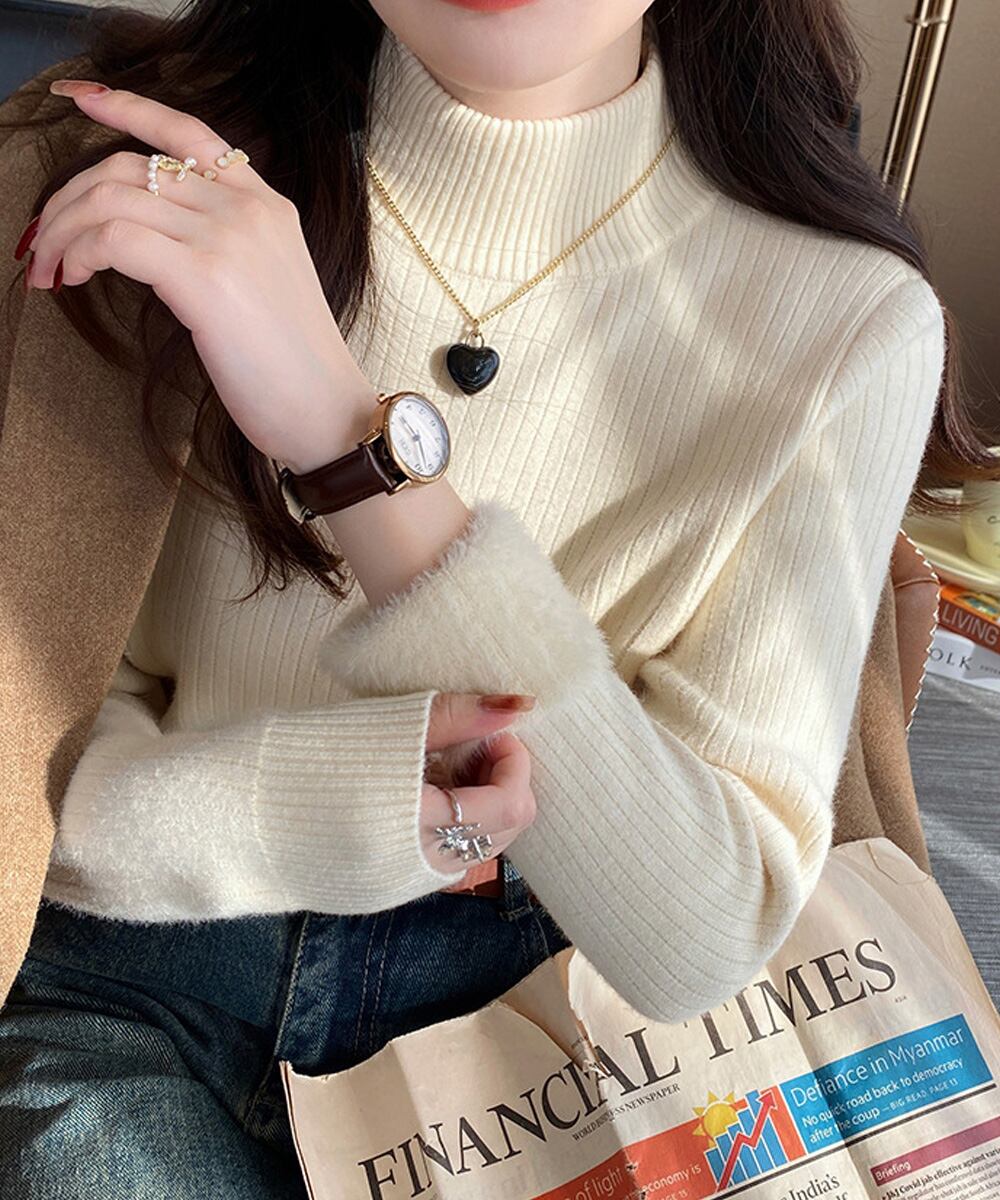 レディース 長袖 無地 暖かい プルオーバー ニットインナー シンプル カジュアル 通勤通学 フェミニン きれいめ 防寒